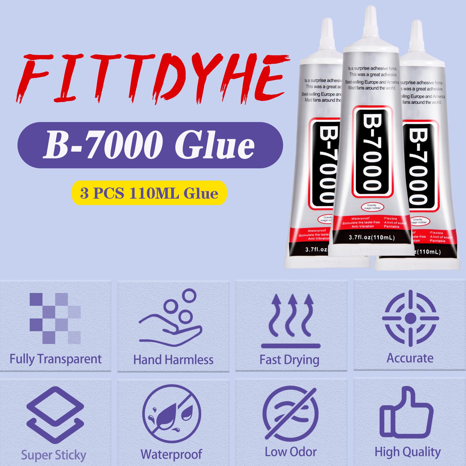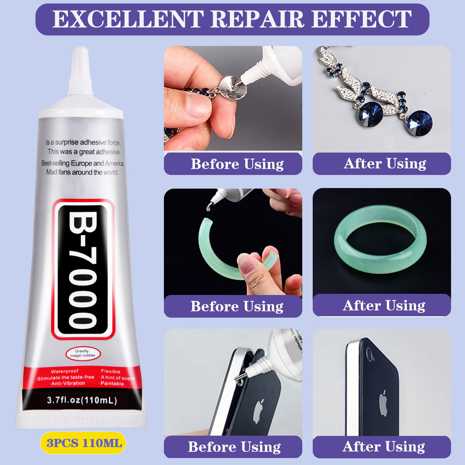 【Upgraded 110ML B7000 Glue】B-7000 rhinestone clear glue can isolate gas, liquid and air flow, which is transparent, waterproof and highly elastic. This transparent glue will not leave stains after use. That makes it great for restoring phones and jewelry. It has such a restorative effect that no one will know that your item has been restored. You can also use it to make all kinds of handicrafts.