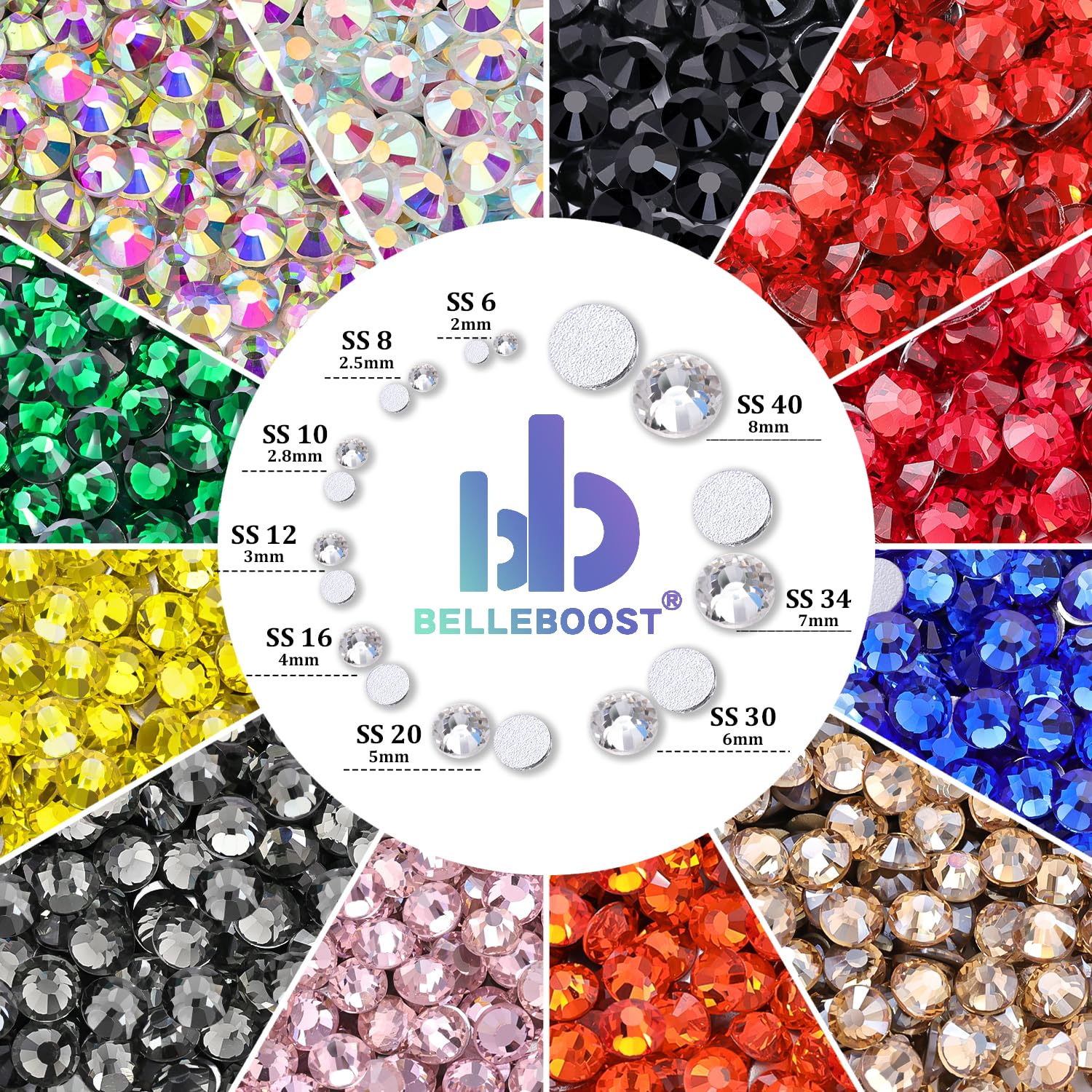 💎ONE-STOP PURCHASING -- The rhinestones are packed by weight, with each pack containing approx. 5000 pcs. Our store offers a variety of colors and sizes of Glass rhinestones for your one-stop purchasing. By choosing glass rhinestones with similar or contrasting colors, you can create color-coordinated or highly contrasting works, such as phone cases with gradient effect or colourful festival decorations.