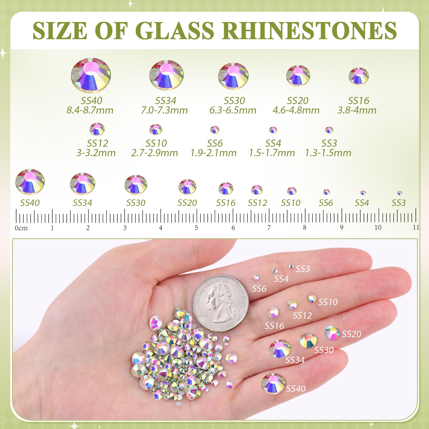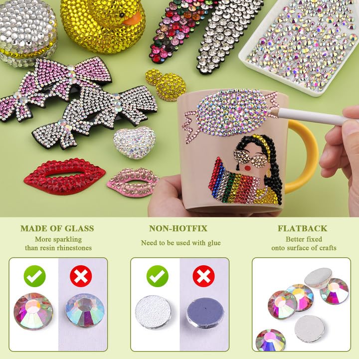 💎WIDE APPLICATION -- The iridescent and bedazzling gems will remarkably add glitz to your DIY crafts, like shoes, sneakers, high heels, tumblers, mugs, goblets, bottles, clothes, dresses, jeans, hats, masks, glasses, phone cases, popsockets, scrapbooks, diamond paintings, greeting cards, bags, guitars, keychains, hair clips, etc. You can use them for face makeup, eye makeup, body art, 3D nail art as well. Apply it to whatever you want to bedazzle!
