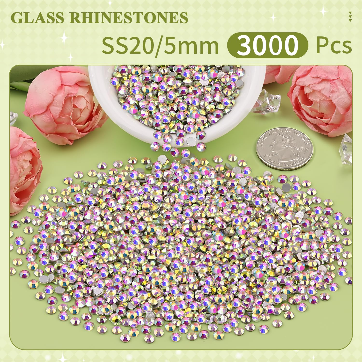 💎WHAT WILL YOU GET -- The package contains about 3000 pcs SS20 (0.2") blingbling glass rhinestones (Crystal AB). The large amount will support you to fulfill a number of your wonderful DIY decoration ideas. Additionally, 1 tweezers and 1 pickup pen are included to easily pick up glittering gems.
