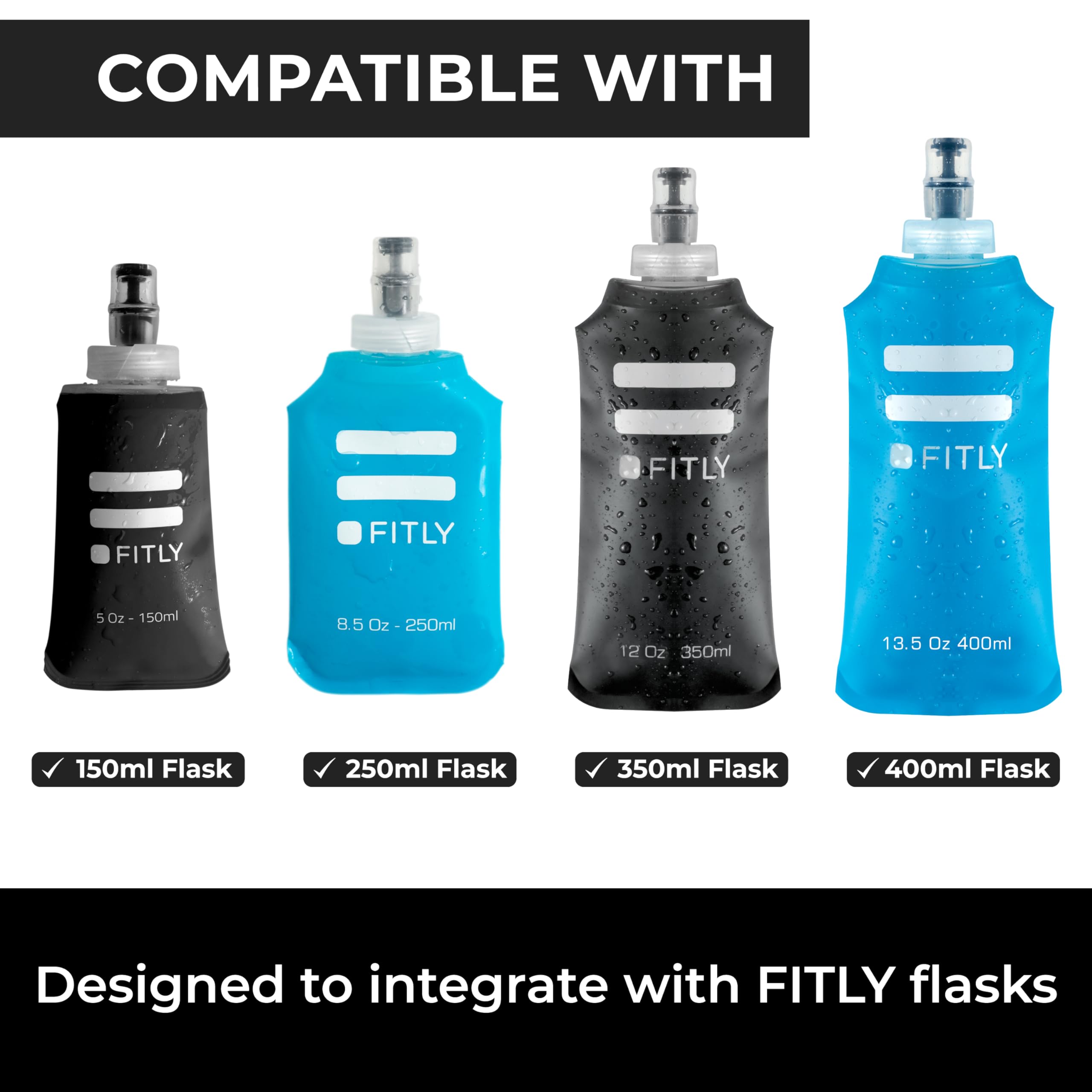 CUSTOMIZED FITLY SOFT FLASK INTEGRATION: Your ultimate companion for staying hydrated during runs, trail running, marathons, hikes, workouts, and intense activities. Our handheld water bottle for running has been tailored exclusively for Fitly Flasks (F1, F2, F3, F4), ensuring a snug fit and eliminating any unnecessary bulkiness. With the included F3 350ml flask and the option to swap with other FITLY flasks, you have versatile hydration solutions at your fingertips.
