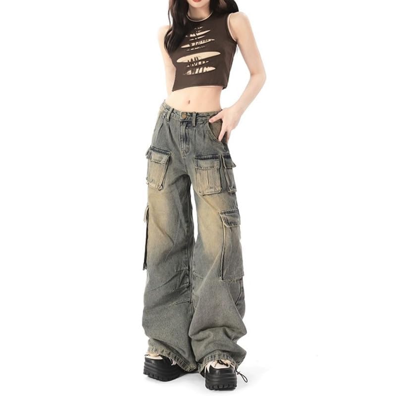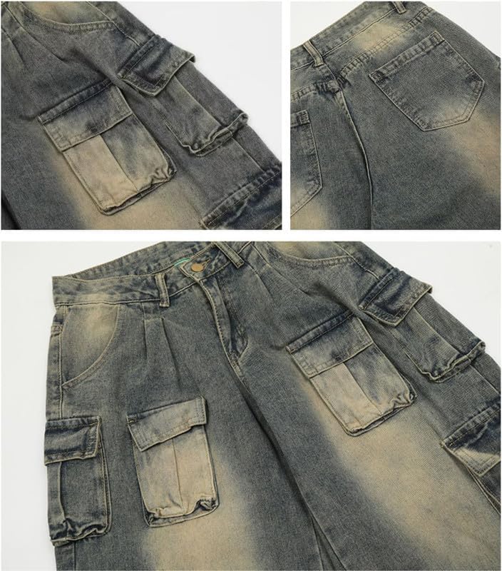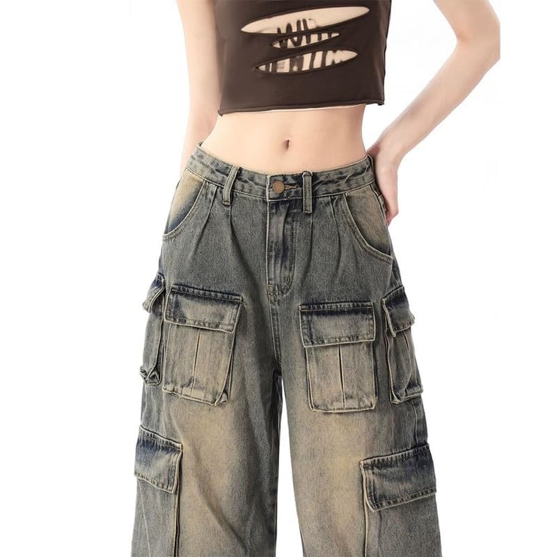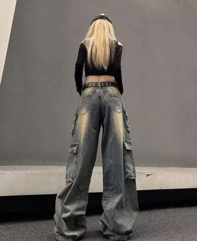 Style Information: Classic 10 Pockets, womens cargo pants with pockets,oversized blue cargo pants, baggy jeans for woman, zipper/buttons.