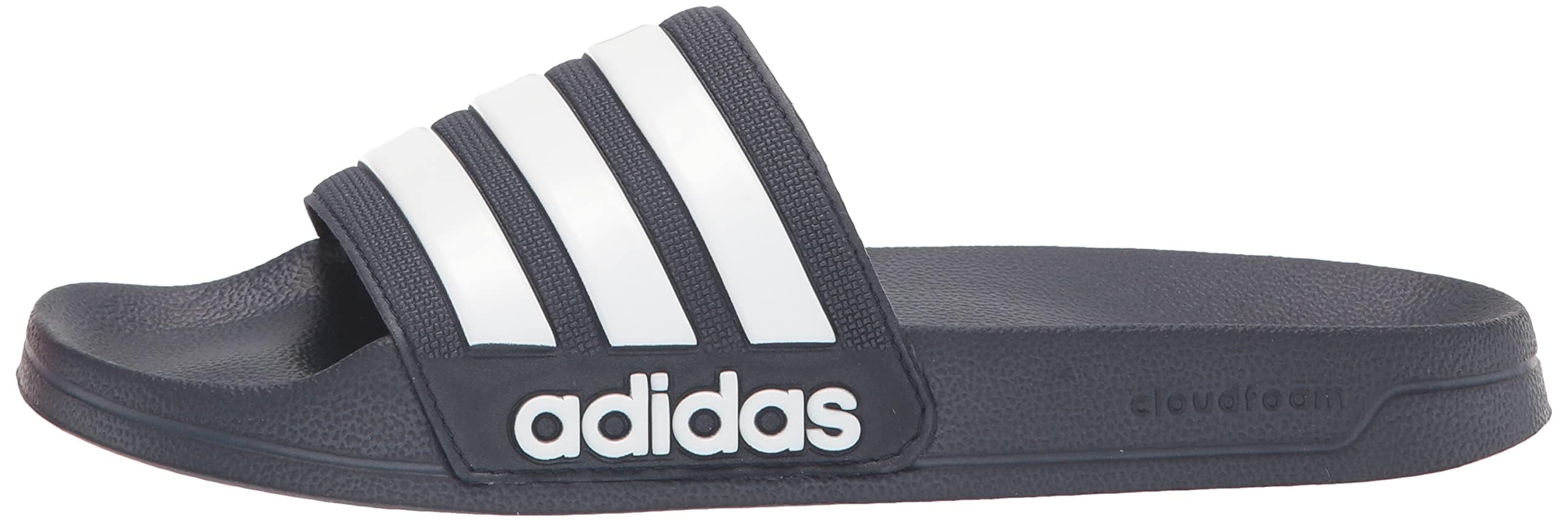 Description These Adilette Aqua Slides bring welcome comfort to tired feet. They have a one-piece molded EVA upper and a plush Cloudfoam footbed. Hit the shower in adidas 3-Stripes.