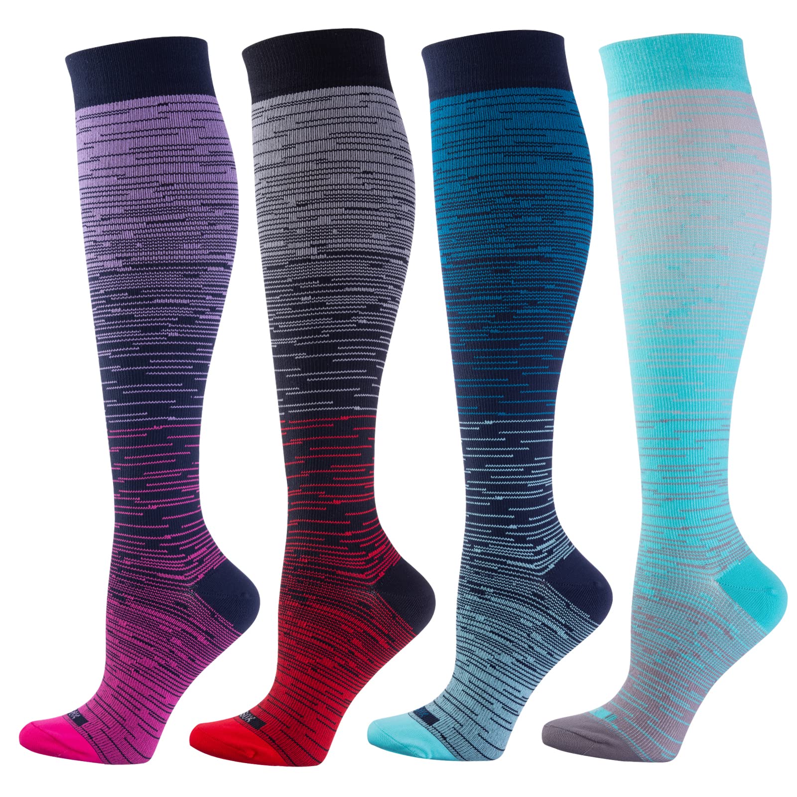 COMPRESSION SOCKS 20-30 mmHg. A Durable Compression Socks have wide variety of fun colors and designs specially for nurses, size rang cover both women and men. Double stitched with functional Fabric and knitted with seamless compression technology. Fits comfortable, easy to get on and delivers 360° support to feet and legs. Knee high long sleeves compression socks make sure the graduated support effect entire calf.