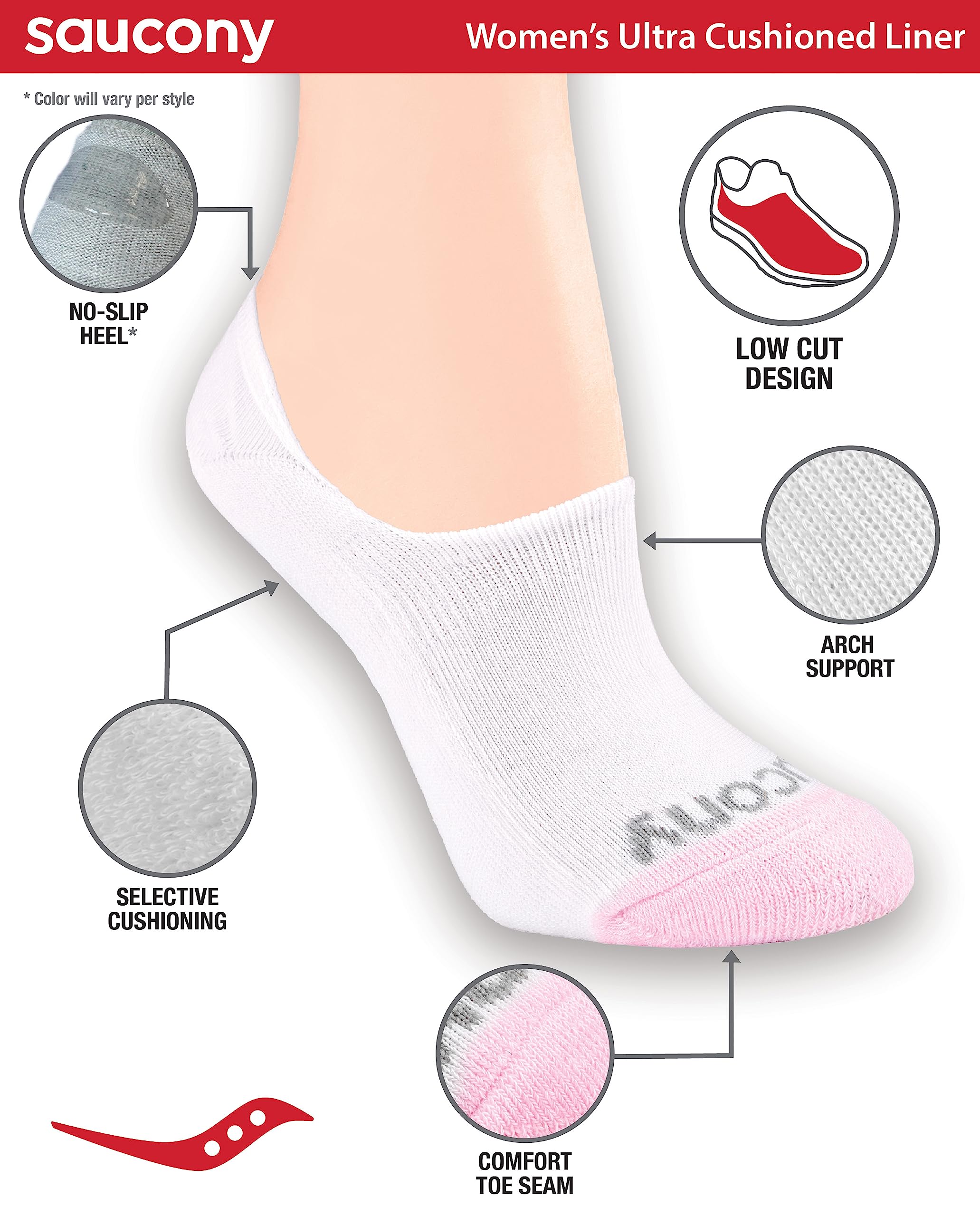 Description Saucony women's performance liner socks is a perfect combination of comfort, stay-put fit. Great for the toughest training session or when you just want comfortable Feet all day. Features include silicone heel grip for stay-put socks, arch support and select cushioning for lasting comfort, Comfort toe seam, and air mesh ventilation.