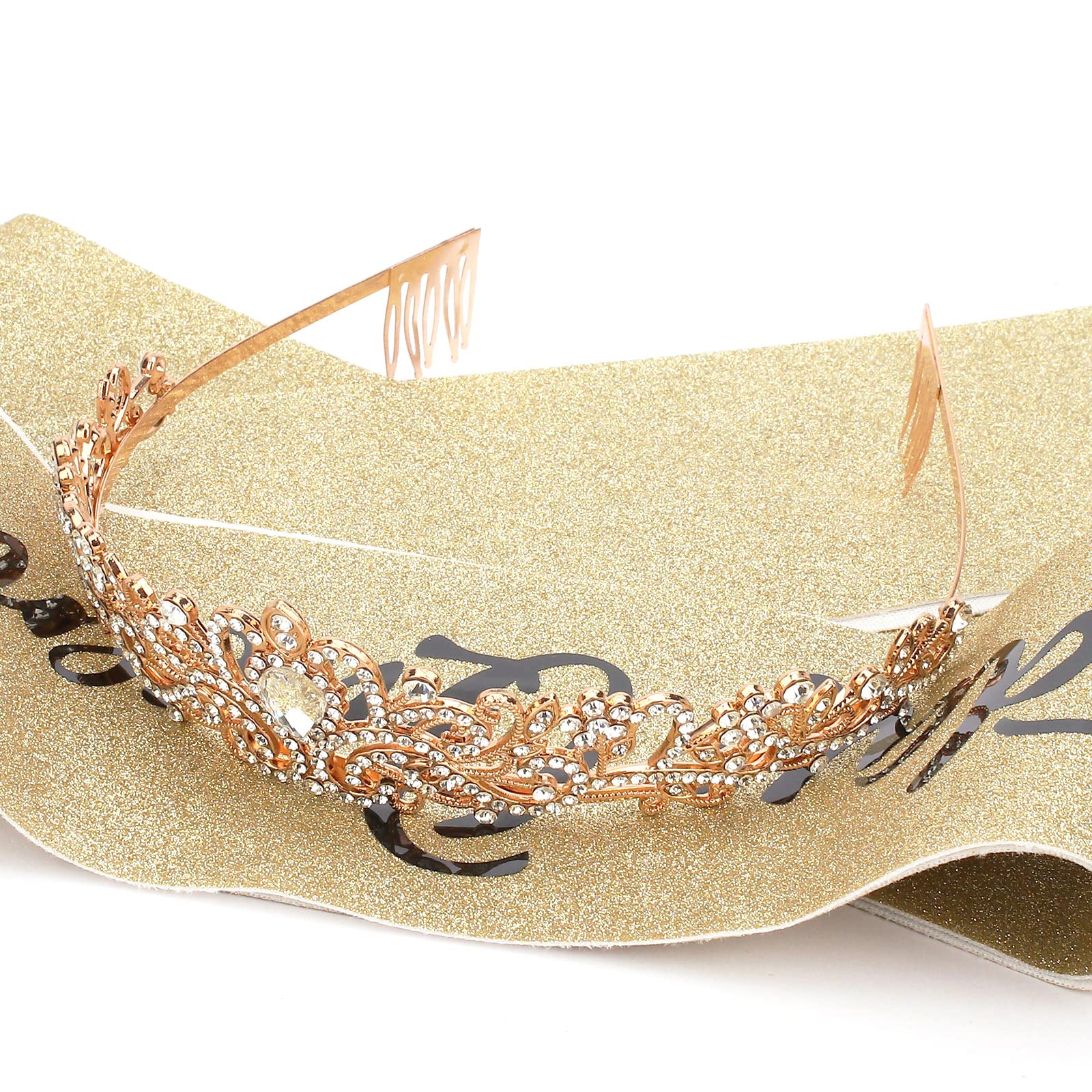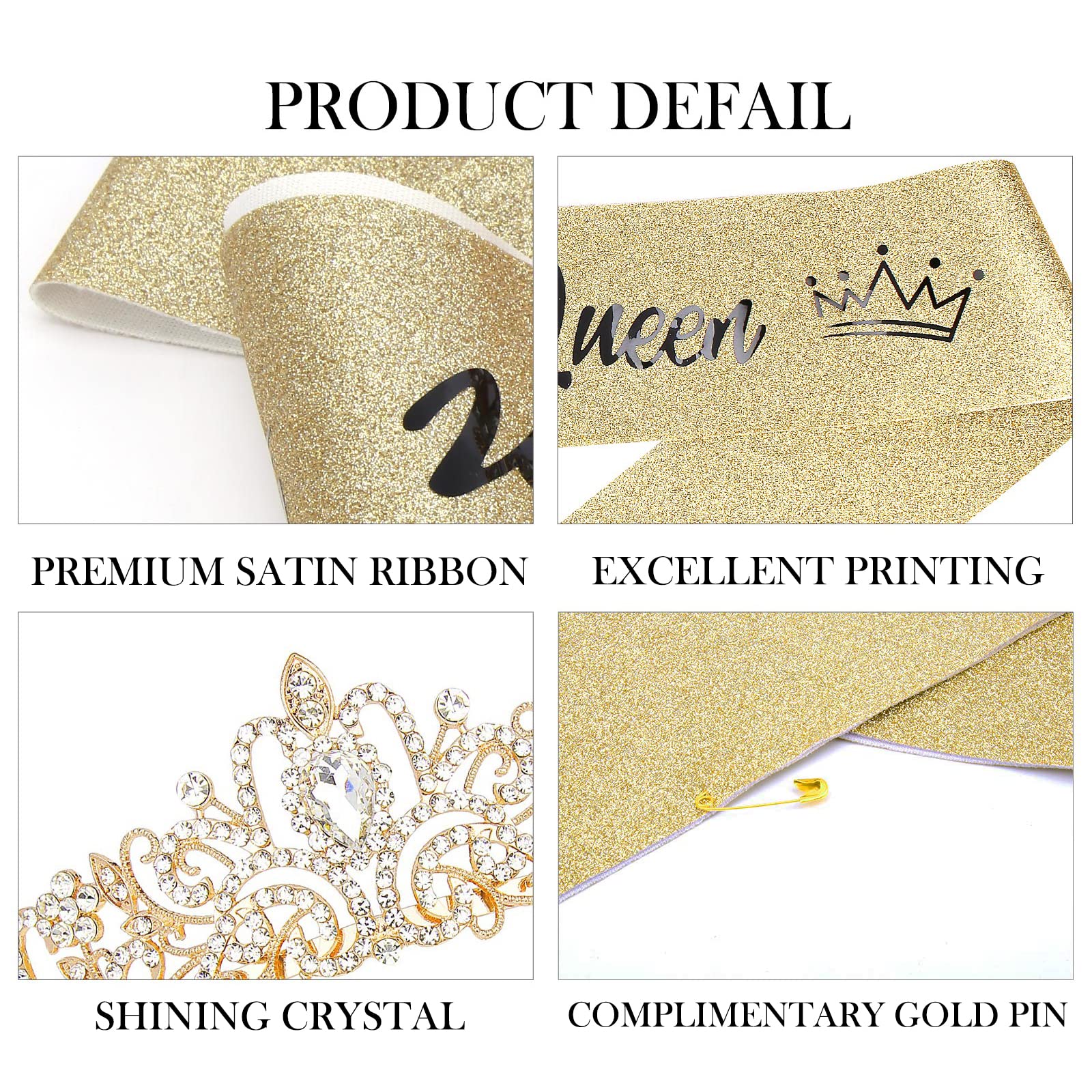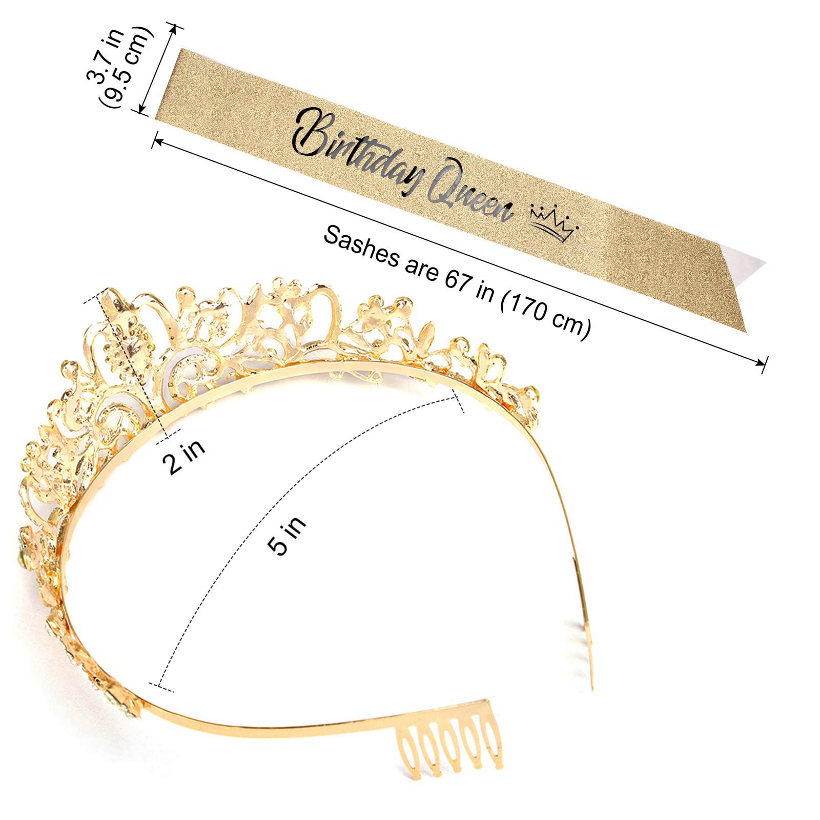 🎁SASH + CRYSTAL TIARA - Our sash is constructed of the most beautiful glitter material and hand pressed foil that reads "BIRTHDAY QUEEN" - each sash measures 3.5 inches wide and 33 inches long. The birthday tiara is made of rhinestone and alloy, sparking and beautiful make you more charming and eye-catching. Each tiara measures 4.92 in (12.5 cm) in diameter, 1.57 in (4 cm) in height.