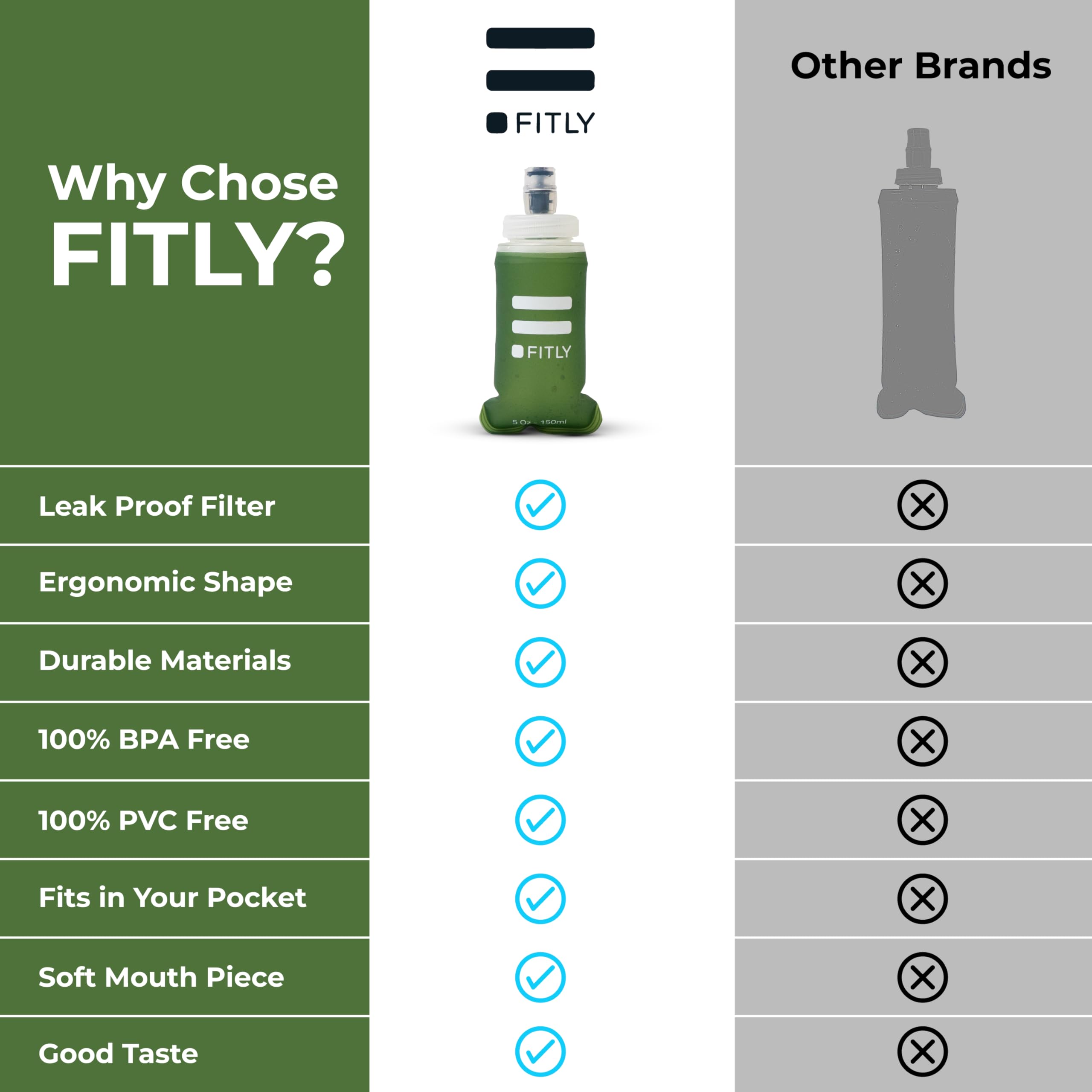 STAY LIGHT ON YOUR FEET: FITLY’s collapsible flask is purposely lightweight, ensuring you stay light on your feet and not weighted down by unnecessary bulk. At FITLY, reusability is deeply important to us, and our water bladder is no exception. Enjoy limitless use from our portable soft water bottle for running vest that is 100% BPA & PVC-free.