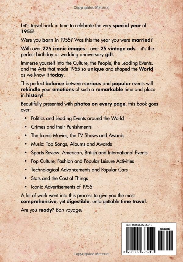 Let’s travel back in time to celebrate the very special year of 1955! Were you born in 1955? Was this the year you were married? With over 225 iconic images – over 25 vintage ads – it’s the perfect birthday or wedding anniversary gift. Immerse yourself into the Culture, the People, the Leading Events, and the Arts that made 1955 so unique and shaped the World as we know it today. This perfect balance between serious and popular events will rekindle your emotions of such a remarkable time and place in history! Beautifully presented with photos on every page, this book goes over: Politics and Leading Events around the World Crimes and their Punishments The Iconic Movies, the TV Shows and Awards Music: Top Songs, Albums and Awards Sports Review: American, British and International Events Pop Culture, Fashion and Popular Leisure Activities Technological Advancements and Popular Cars Stats and the Cost of Things Iconic Advertisements of 1955 A lot of work went into this process to give you the most comprehensive, yet digestible, unforgettable time travel. Are you ready? Bon voyage! Click the “Buy Now” button at the top of the page to begin. Thank you!
