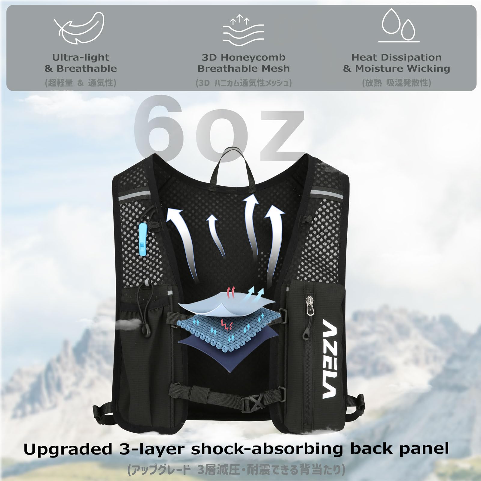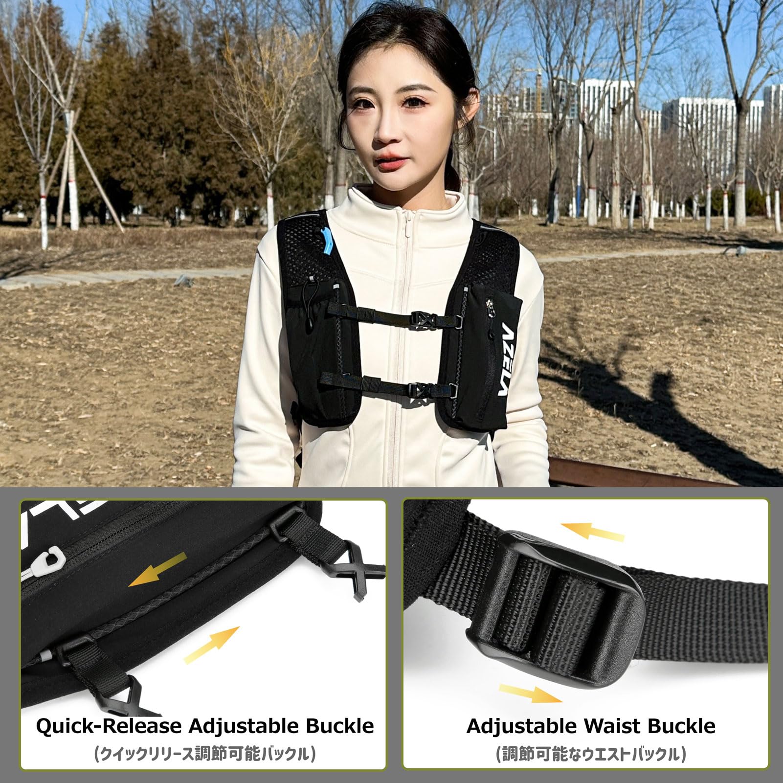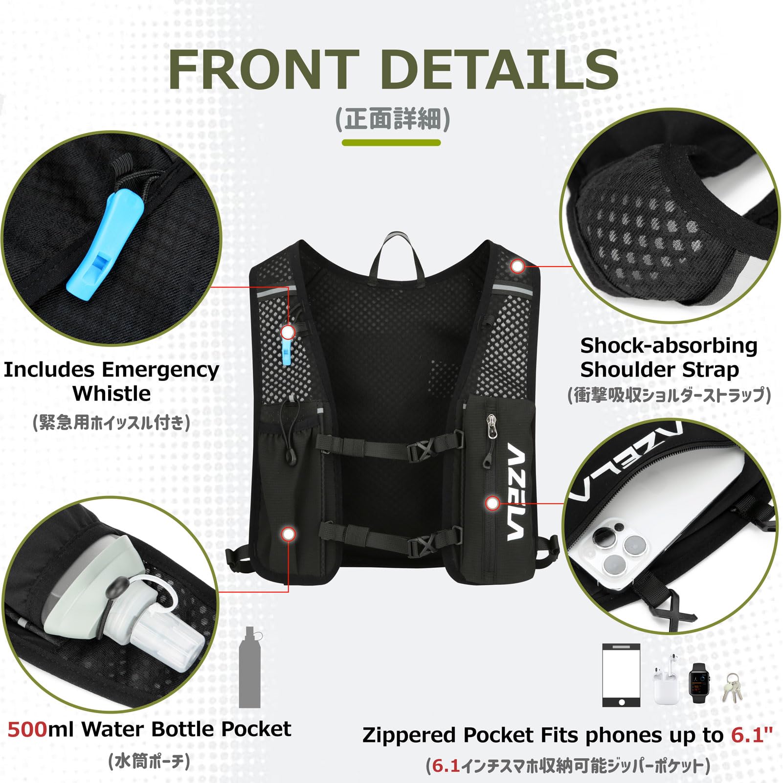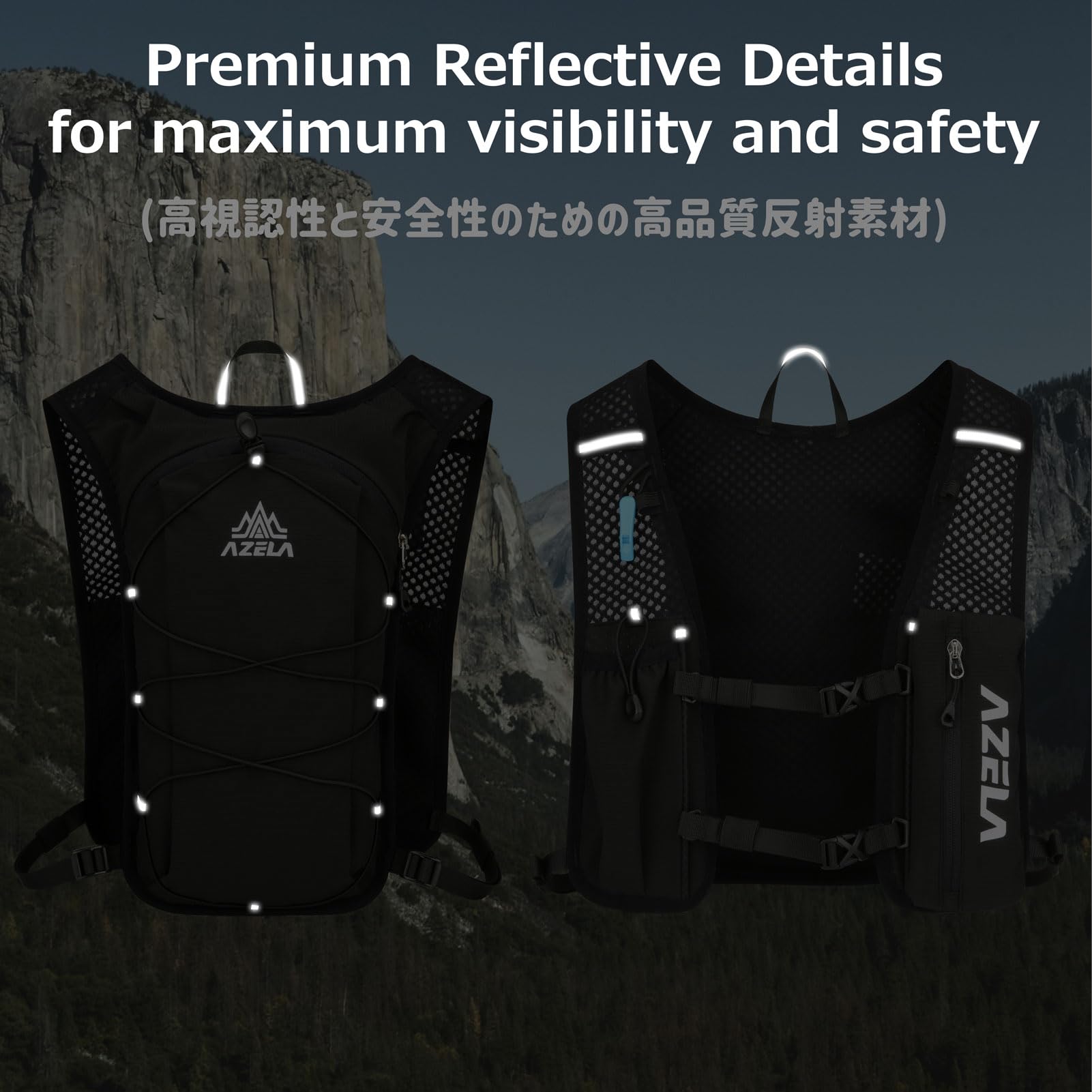 Durable & Safe: Made with water-resistant nylon, premium zippers, and secure fasteners, this hydration backpack offers lasting durability. Reflective strips and a safety whistle enhance visibility and safety during morning/night runs and trails