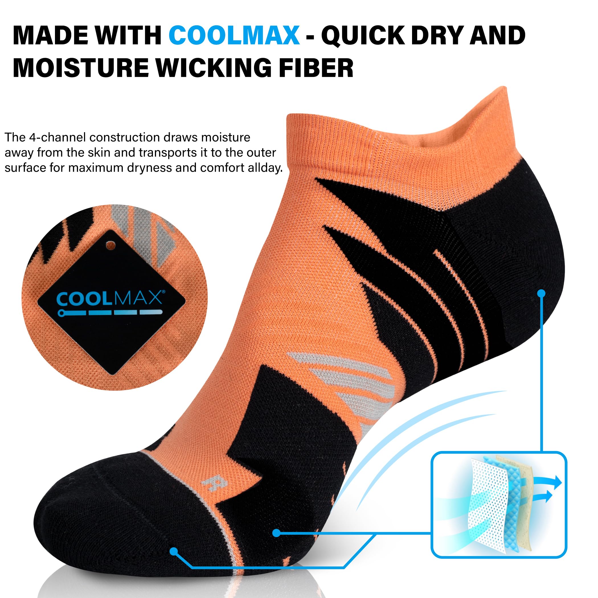 Anti odor and Moisture Wicking Socks: Made from high-end moisture control and quick dry CoolMax fiber, Our workout socks move perspiration away effectively from skin surface so as to keep feet fresh and dry. Nice anti-Odor and anti-blister short socks help you avoid embarrassment
