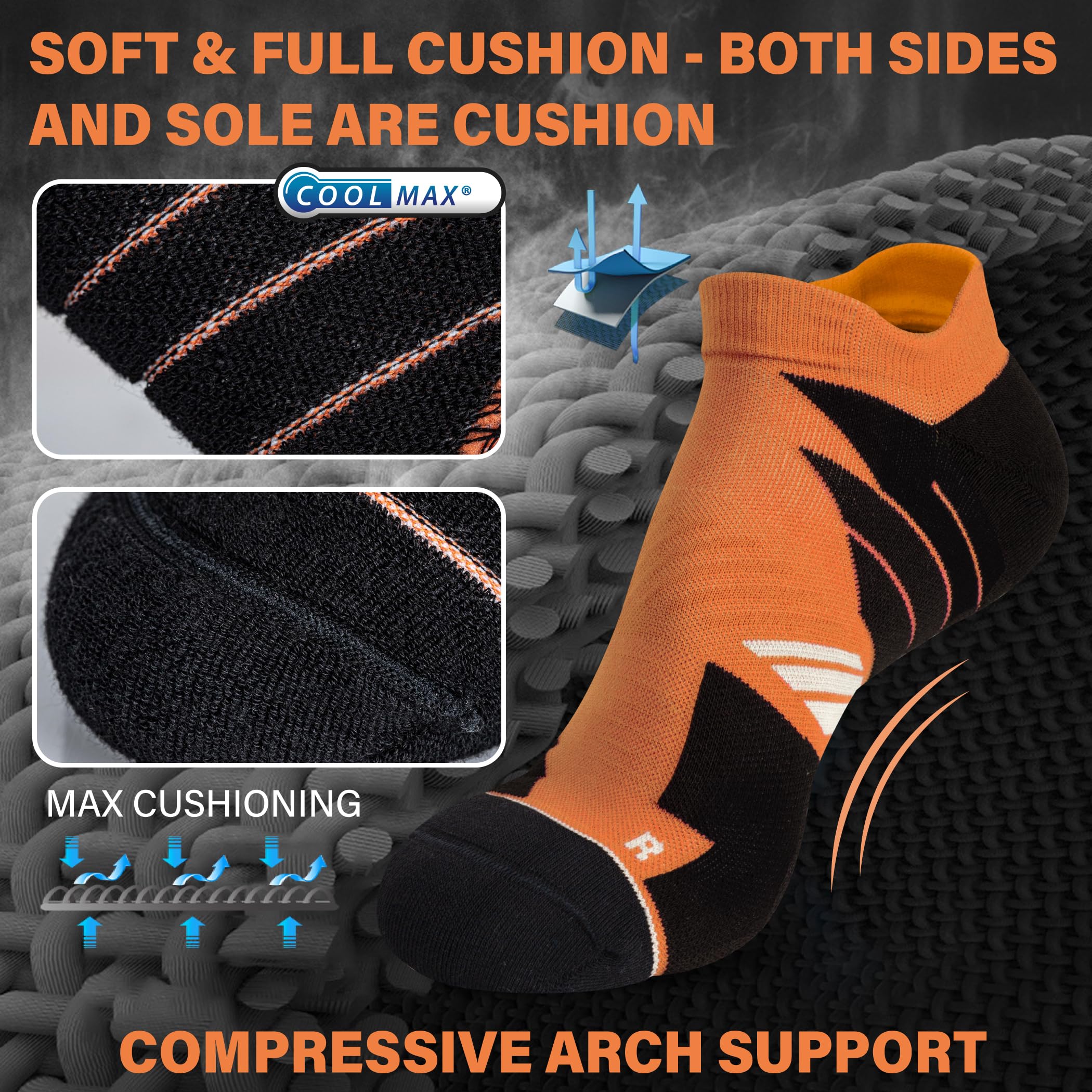 Anti-blister Cushioning and Compressive Arch Support: No show cushion padded socks can make feet comfort and relaxed (absorb impact and relieve foot fatigue) to promise no blisters after long time work. Compression arch support keeps runners’ arch stable and secure fit, reducing fascia fatigue while running