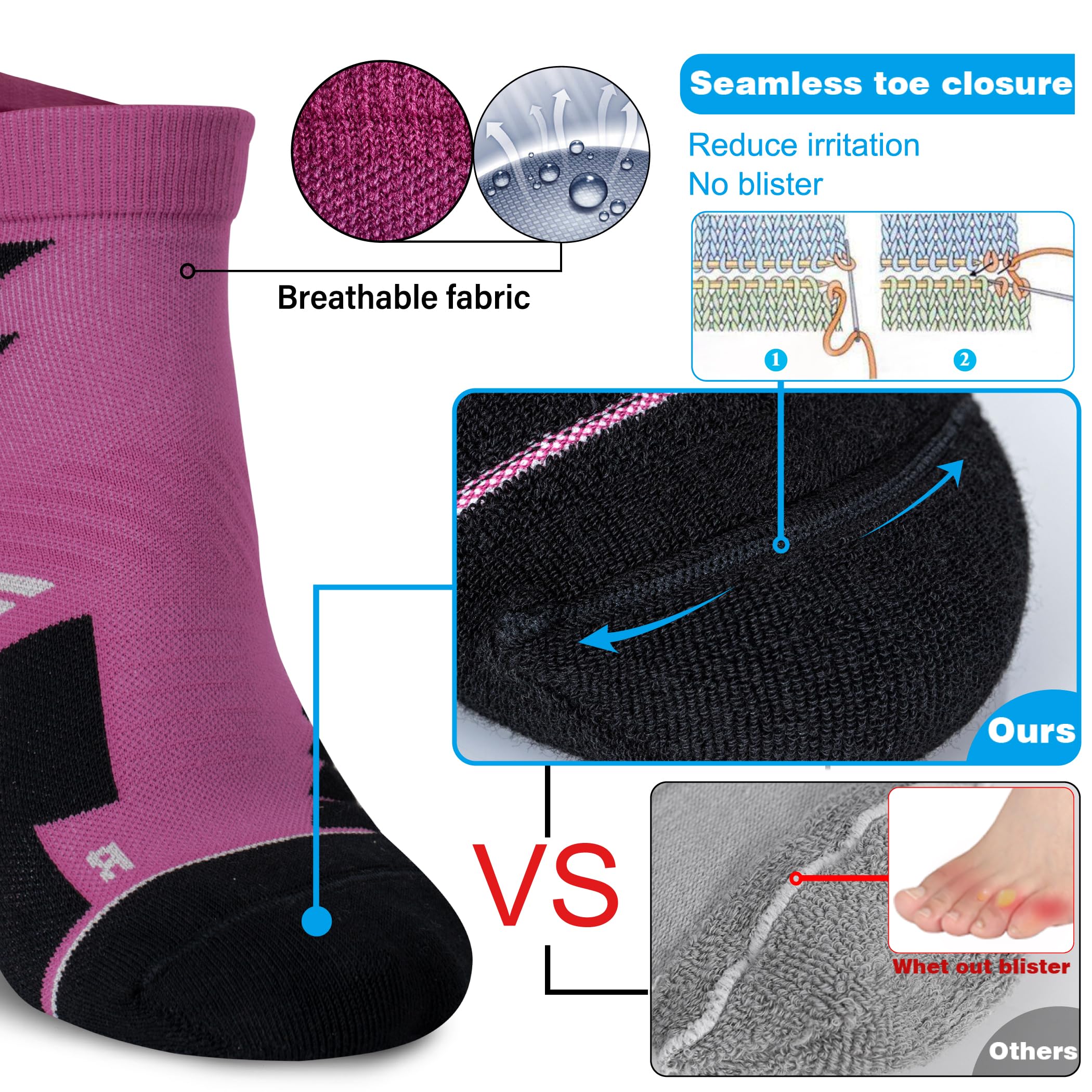 No Show Breathable Socks: Mesh ventilation construction on instep makes sure brethability. Great for many sports or casual wear, such as running, golf, tennis, gym etc. Performance socks with low ankle design feature and light compression match most of your shoes, while high enough to protect your ankle