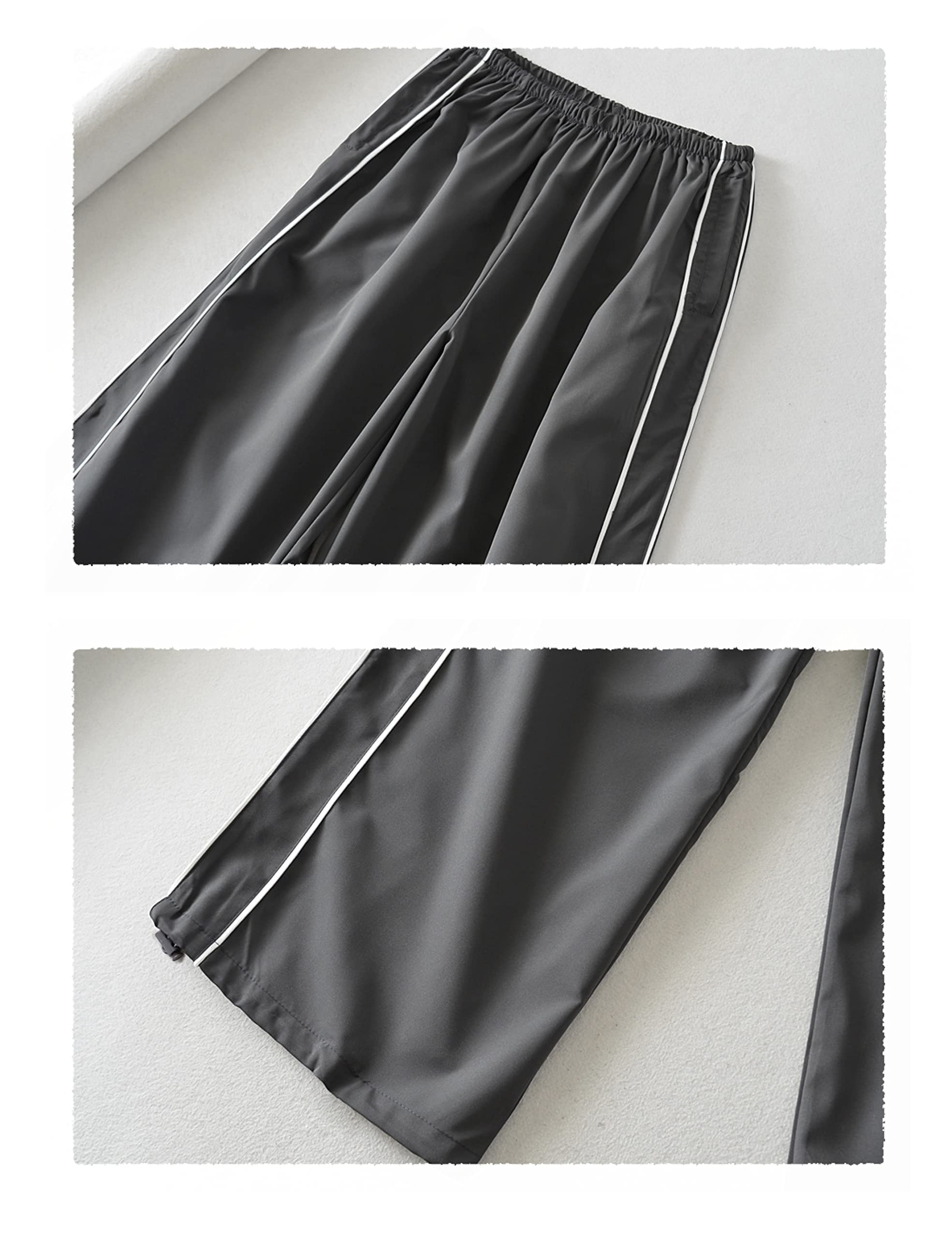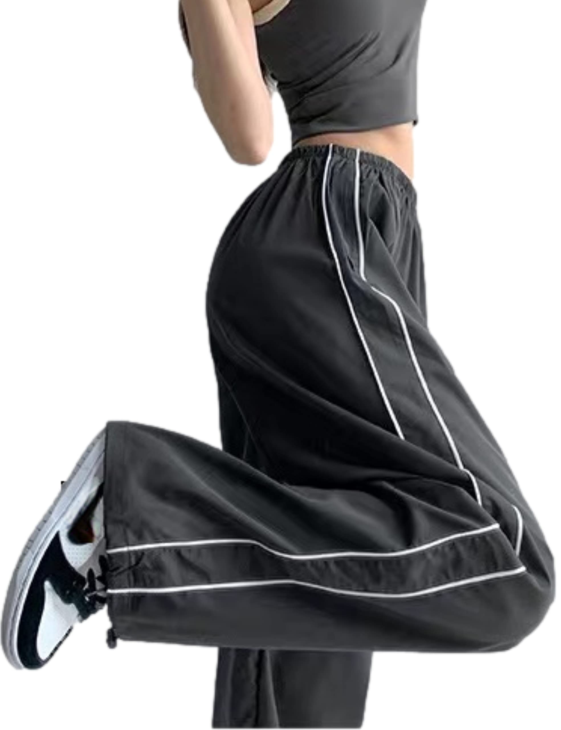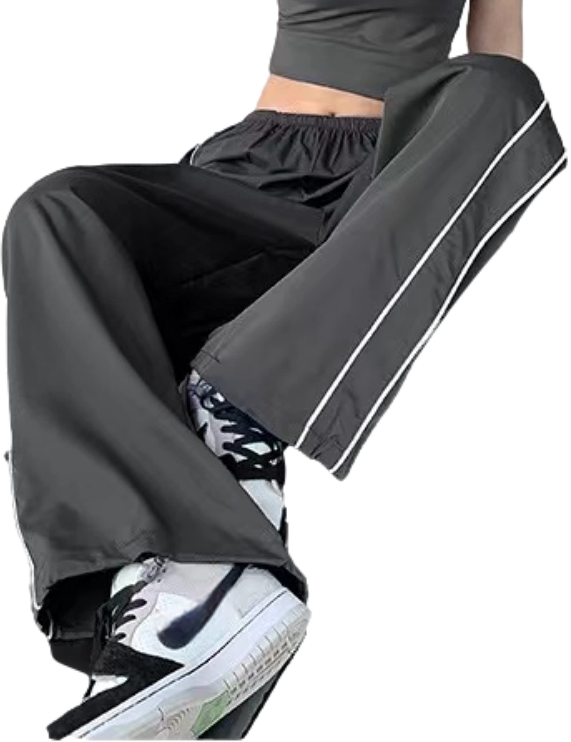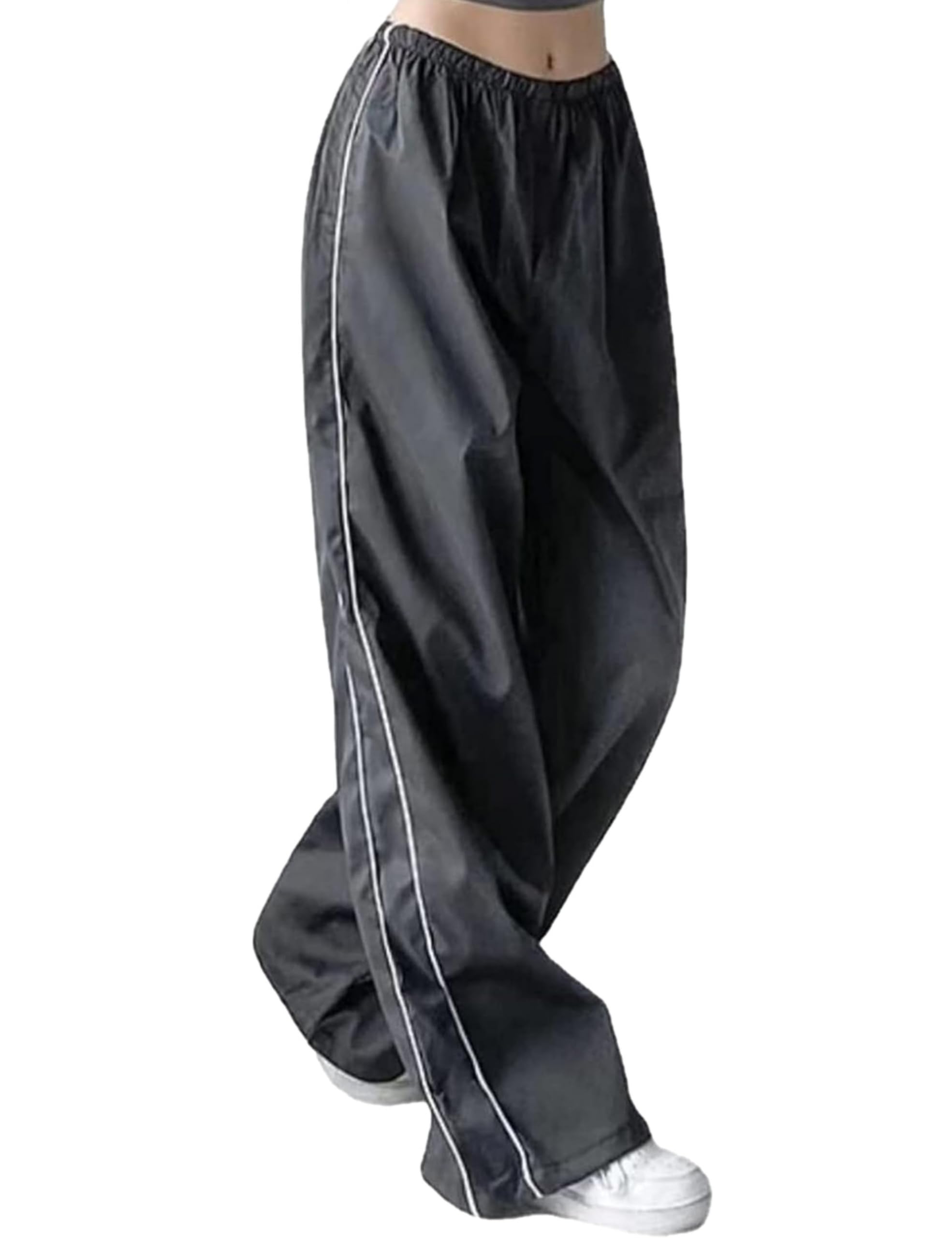 Design: Casual loose parachute pants for women, baggy sweatpants, ankle full length, wide leg trousers, straight leg pants, elasticized stretchy waistband for a flexible fit, simple but versatile, striking side stripes, welt side pockets, adjustable drawstring cuff, adding fashion to your overall dress