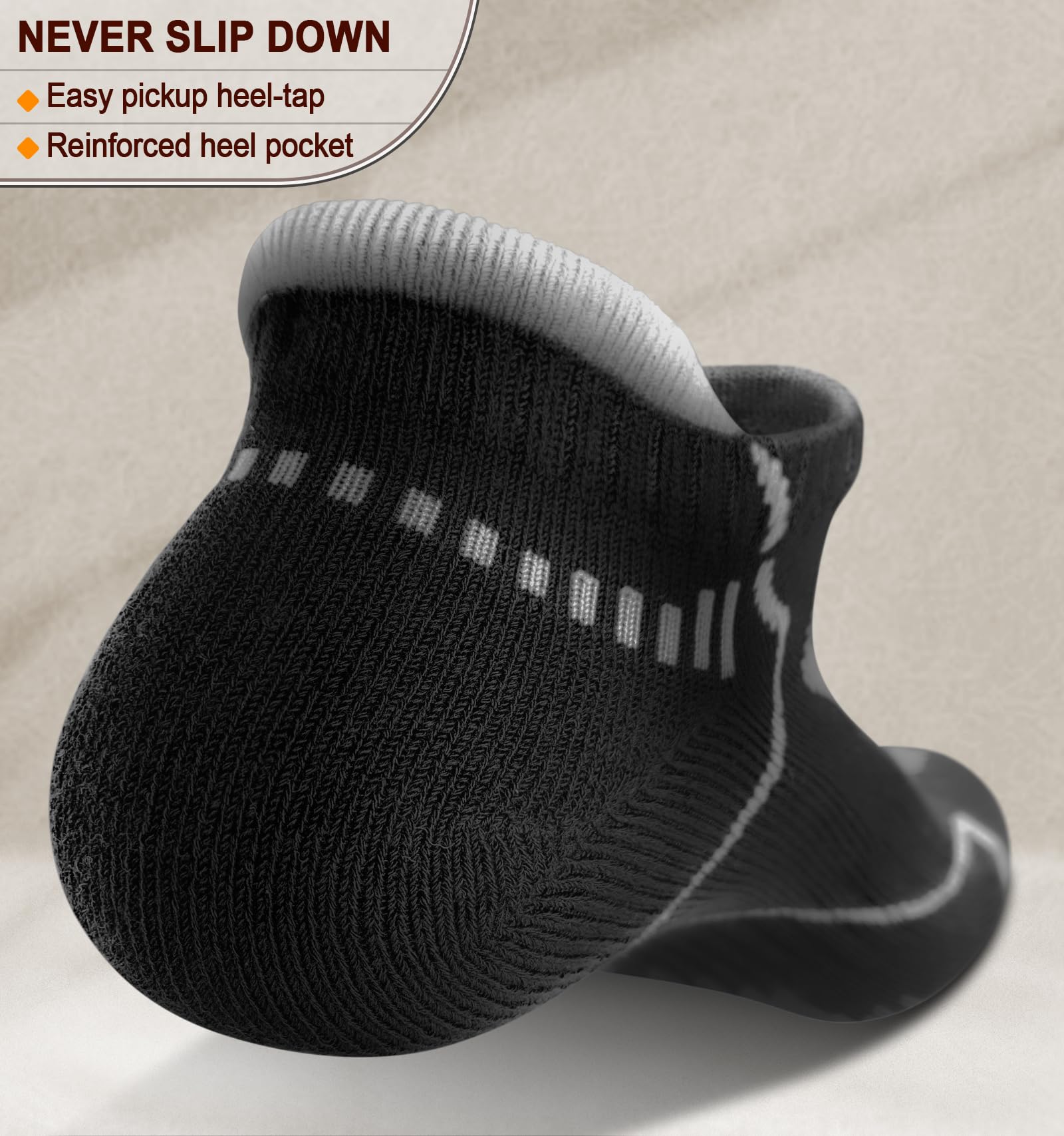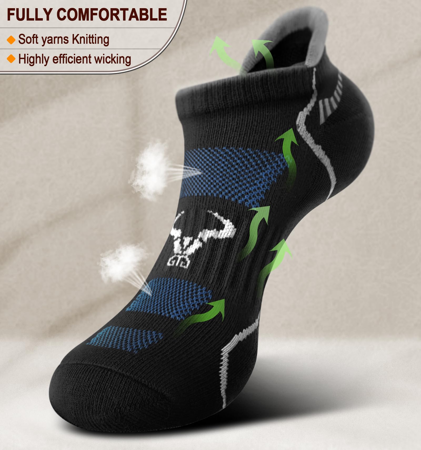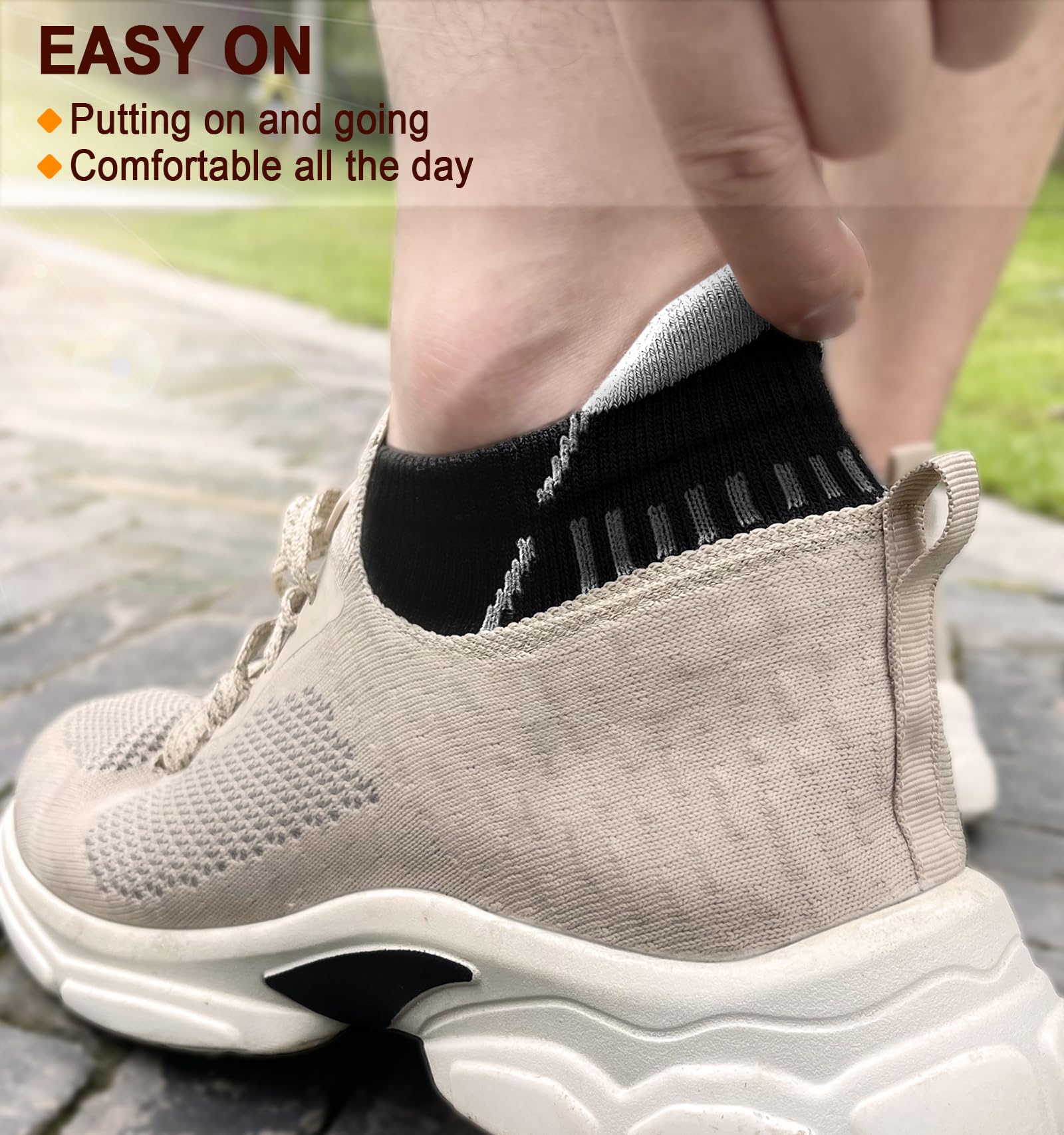 BREATHABLE--Low cut socks with high efficient wicking yarns,plus the net kitting on instep,these socks are super breathable to keep your feet dry and comfortable specially in walking or jogging;
