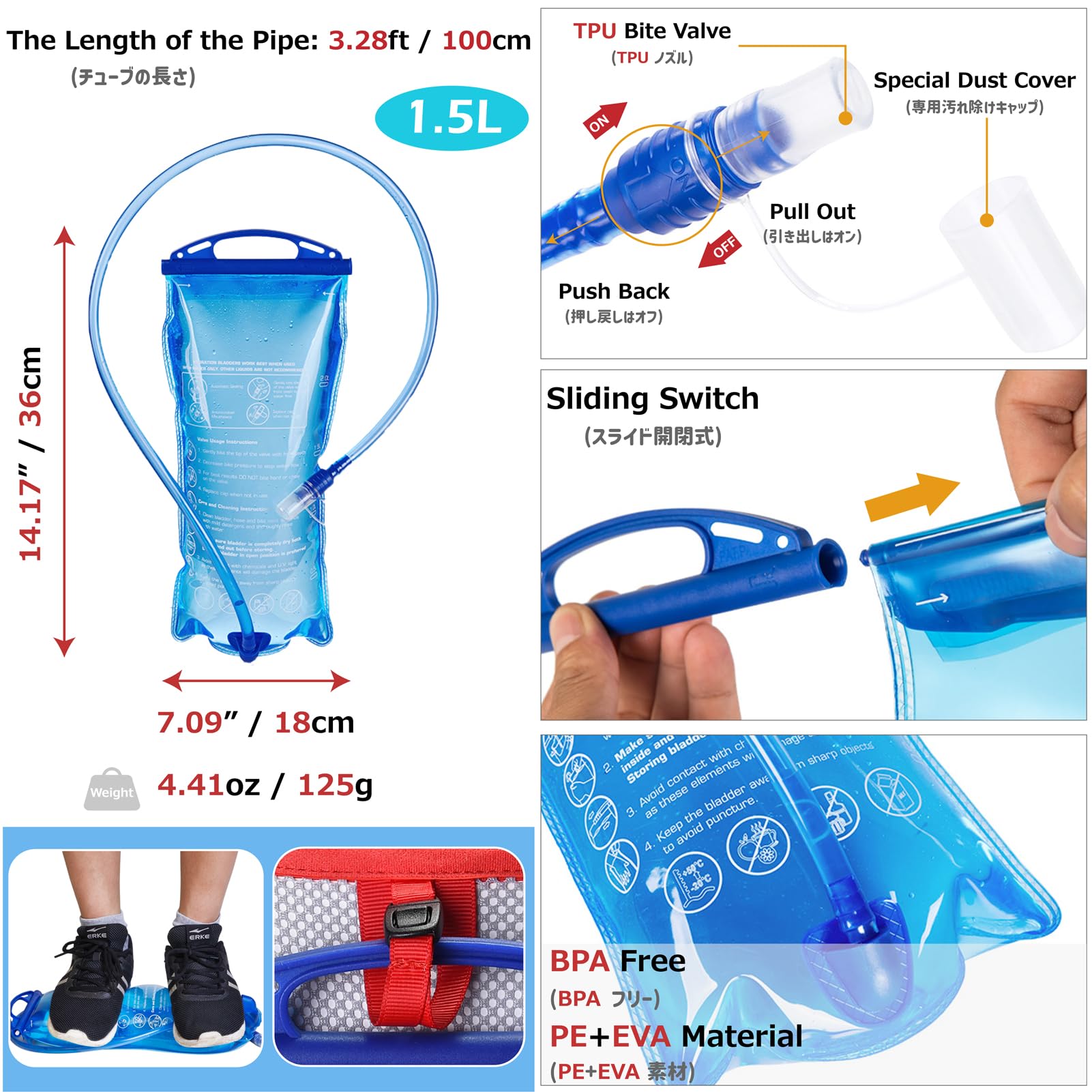Hydration bladder: Equipped with a 1.5L water bladder made from PEVA material, free of BPA. The hydration bladder features complete pressure resistance and leak-proof functionality, ensuring sufficient water supply during various outdoor activities