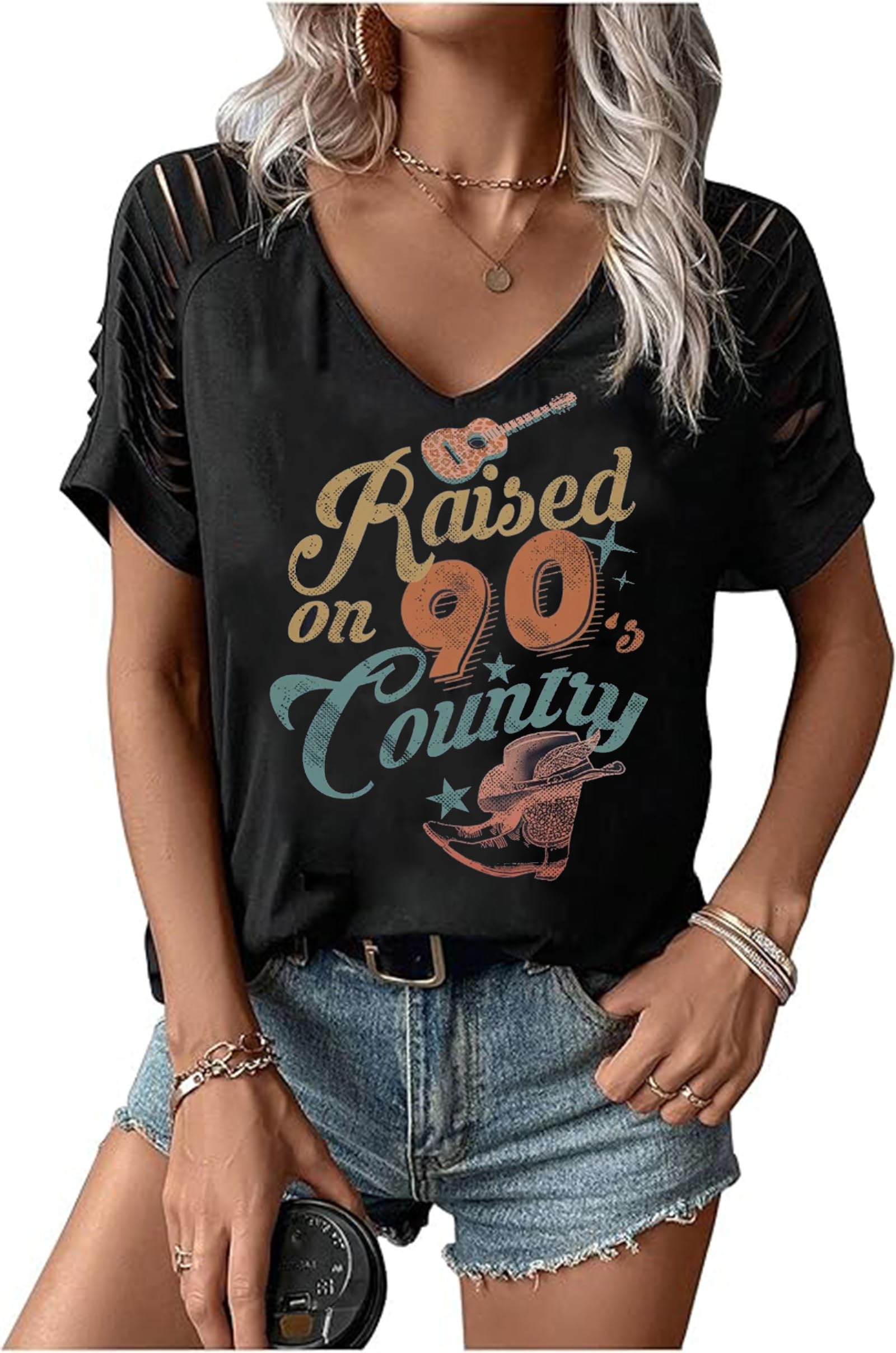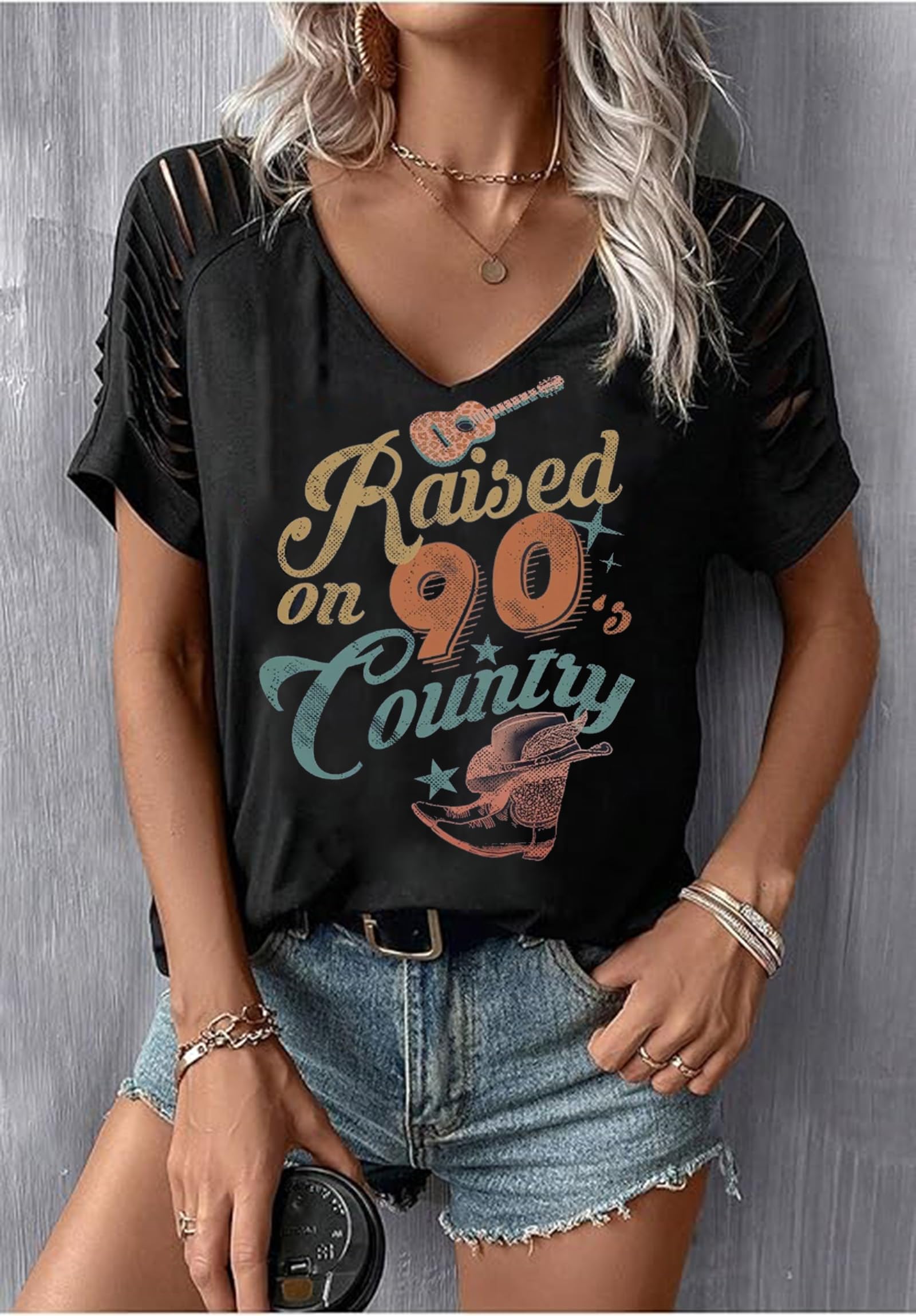 Description Women Rock Band T-Shirts Vintage Rock and Roll Country Music Shirt Cowgirl Western Country Graphic V-Neck Vacation Tops Size Chart: (1Inch=2.54cm) Size S-----Length 64cm/25.2""-----Bust 96cm/37.8"" Size M------Length 66cm/26.0""-----Bust 100cm/39.3"" Size L--------Length 68cm/26.8""-----Bust 106cm/41.7"" Size XL--------Length 71cm/28""-----Bust 112cm/44"" Size XXL--------Length 74cm/29.2""-----Bust 118cm/44.6"" There is a difference of 1-2cm in manual measurement. Attention please: 1. About size item: Measure by hand. it could be 0.5-1 inch different. 2. About color: The picture, color and brightness may differ a little due to different computer monitors or other factors