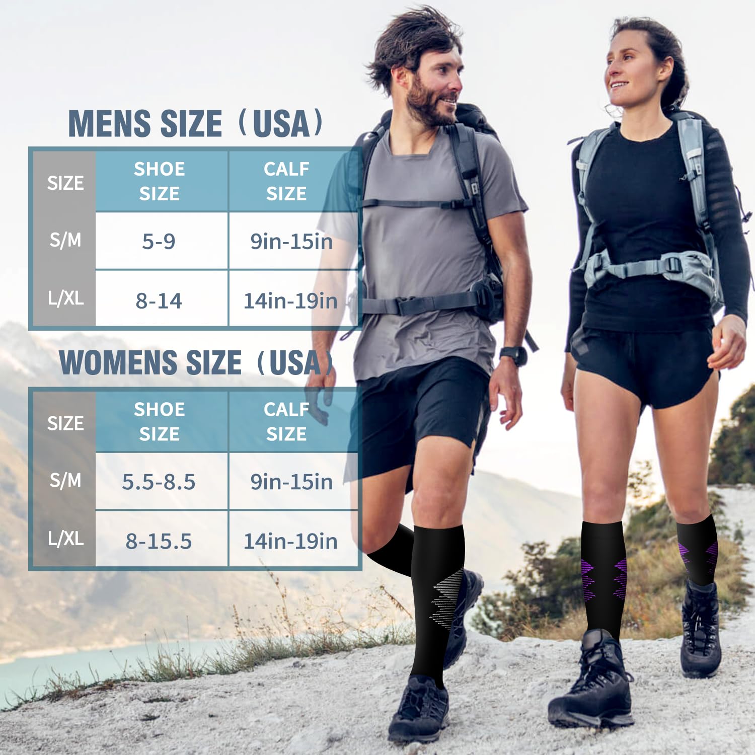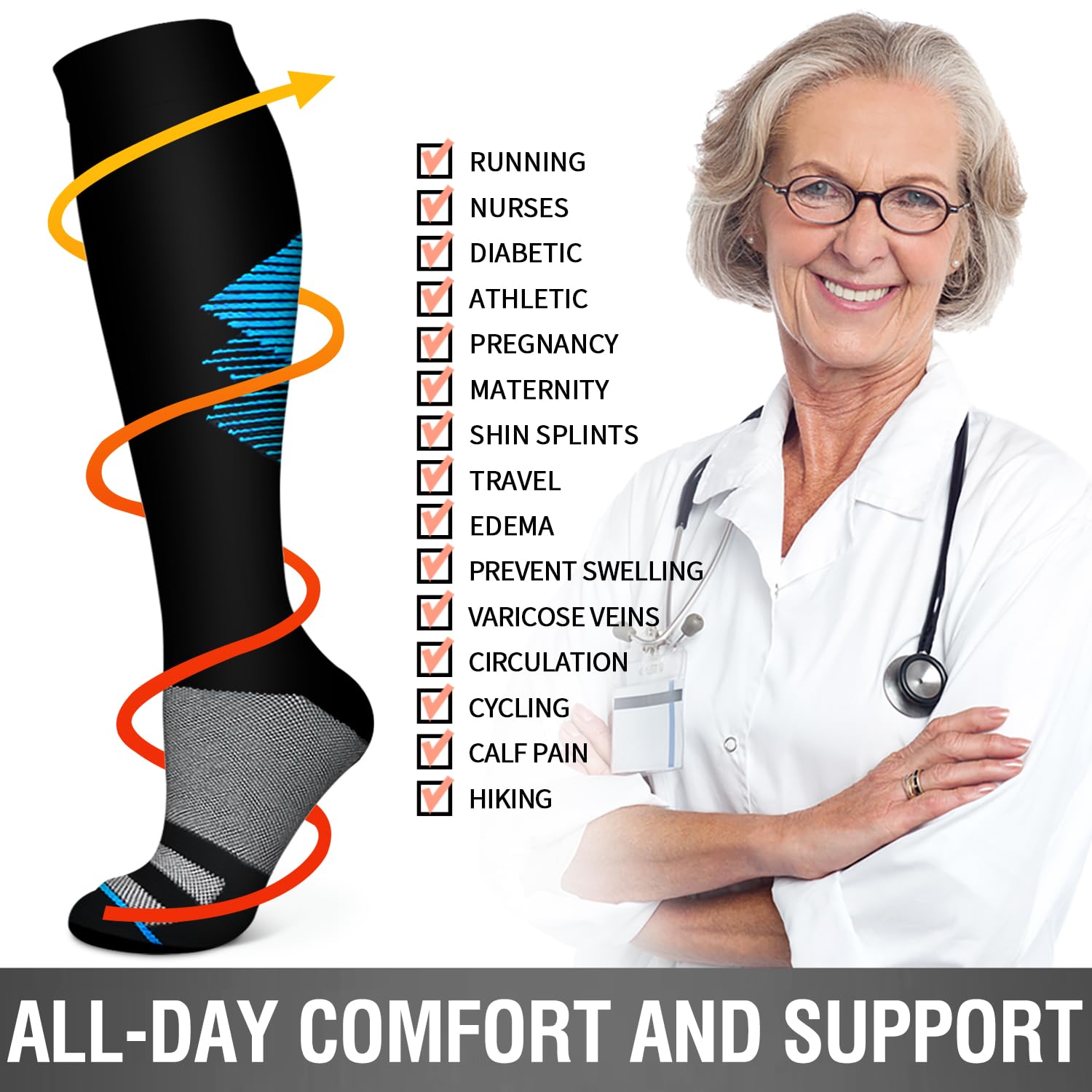 GIVE LIFE TO YOUR LEGS! - More improve circulation means more Healthier legs and less pain+swelling.Our Graduated Compression Socks put pressure in just the right spots.Provides true graduated compression to support your legs,reduce fatigue,soreness,and prevent injuries at the same time.Progressive compression technology has been recognized by many users Our copper compression socks is self-care staples.Make you feel great-no matter where,no matter when,and no matter what you're up to!