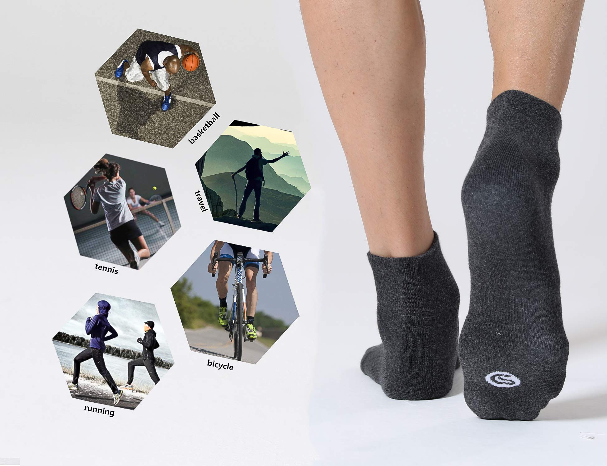 Non Slip Off: Proper compression band designed in arch fits the individual shape of your foot, hugs your foot evenly to keep the sock in position in your shoe. The elastic band holds the mens ankle sock tightly around your ankle, in order to prevent athletic sock sliding from your daily walk, running, cycling, hiking, tennis.