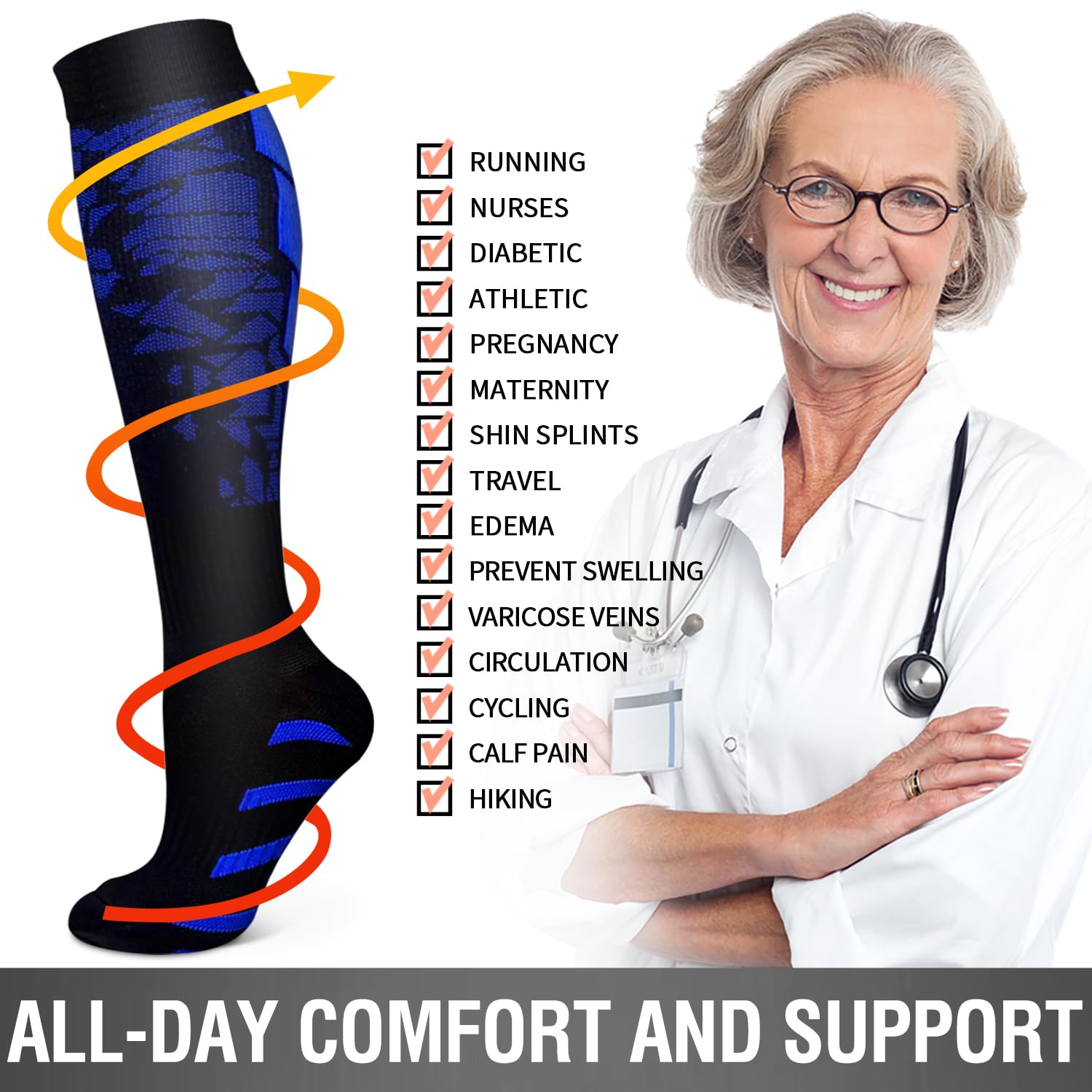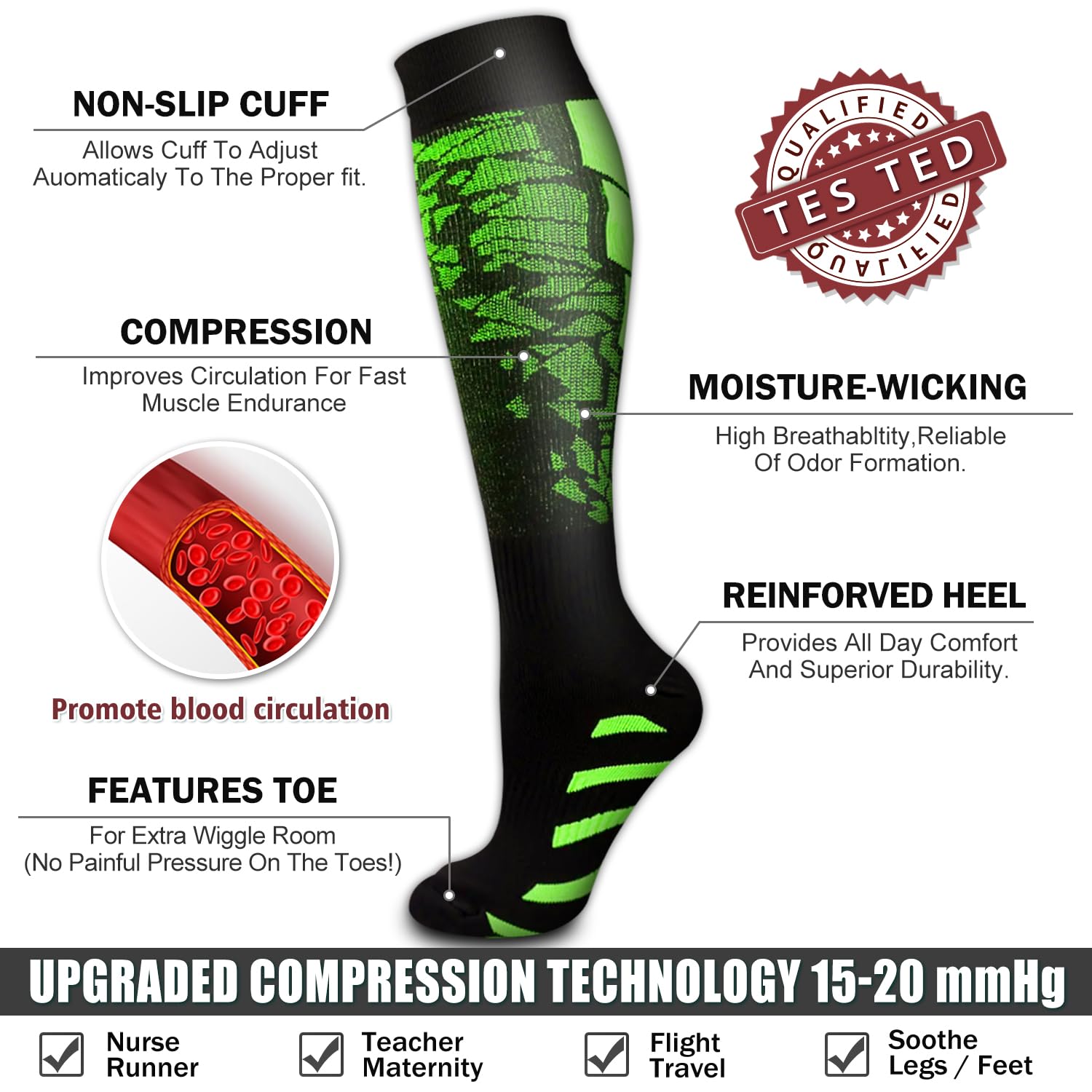 ALL THIS IN A VALUE 6-PACK- Each pack includes 6 pairs of compression socks at an unbeatable price;Superlative compression hosiery does not have to be expensive-our brand provides quality comfort and support identical to the famous brands that cost two to three times more;You decide on the assortment based on your style,age or sex;Each bundle provide the high quality,performance and durability;Ensure the perfect fit