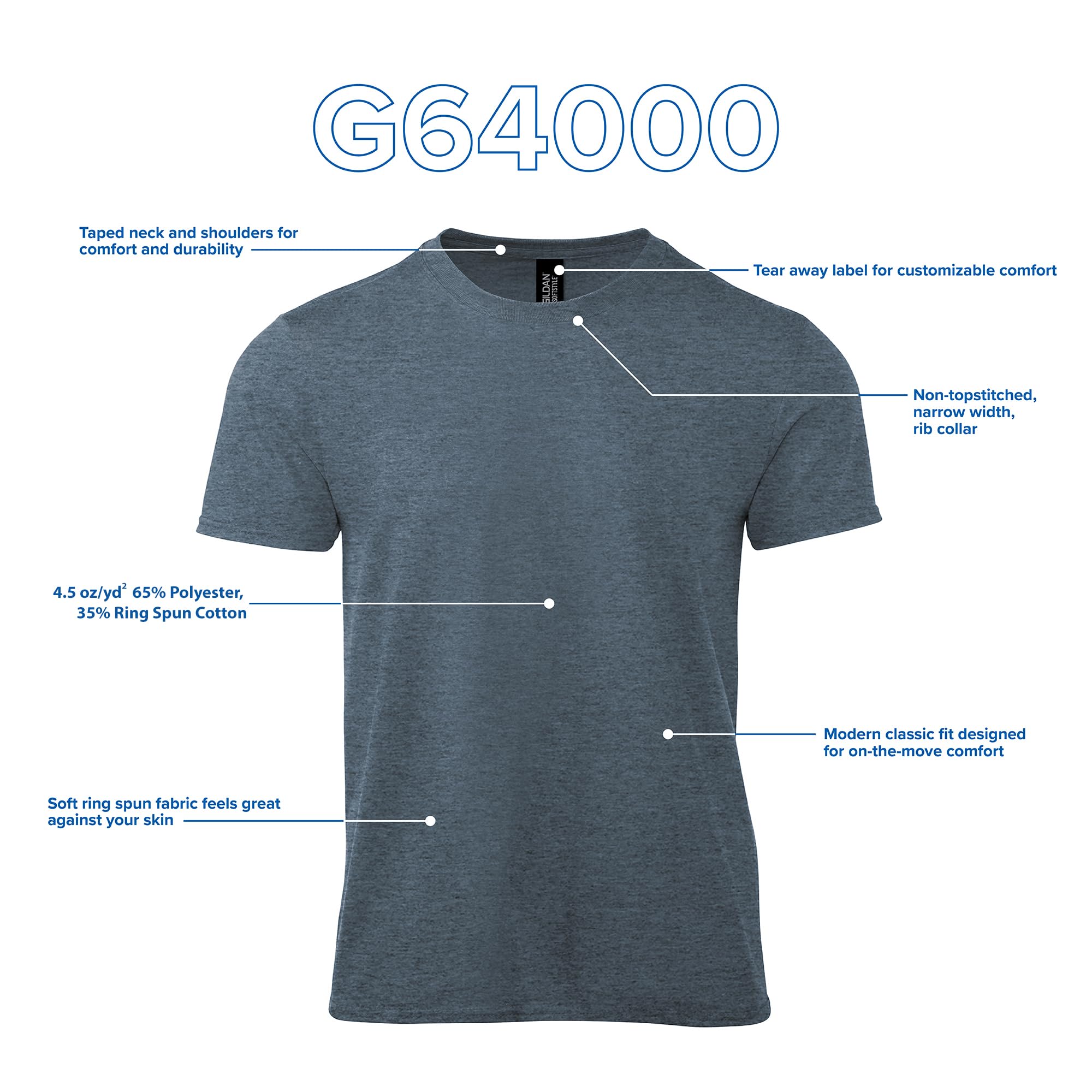 Description Gildan’s Adult Softstyle Cotton Tee G64000 has the perfect combination of softness and durability to ensure it stands the test of time. Made of 100% ring spun cotton with a modern classic cut, it’s perfect for lounging on the couch or going to a movie. Its soft smooth fabric is perfect for screen printing, embroidery, DTG, bleaching and tie dyeing.