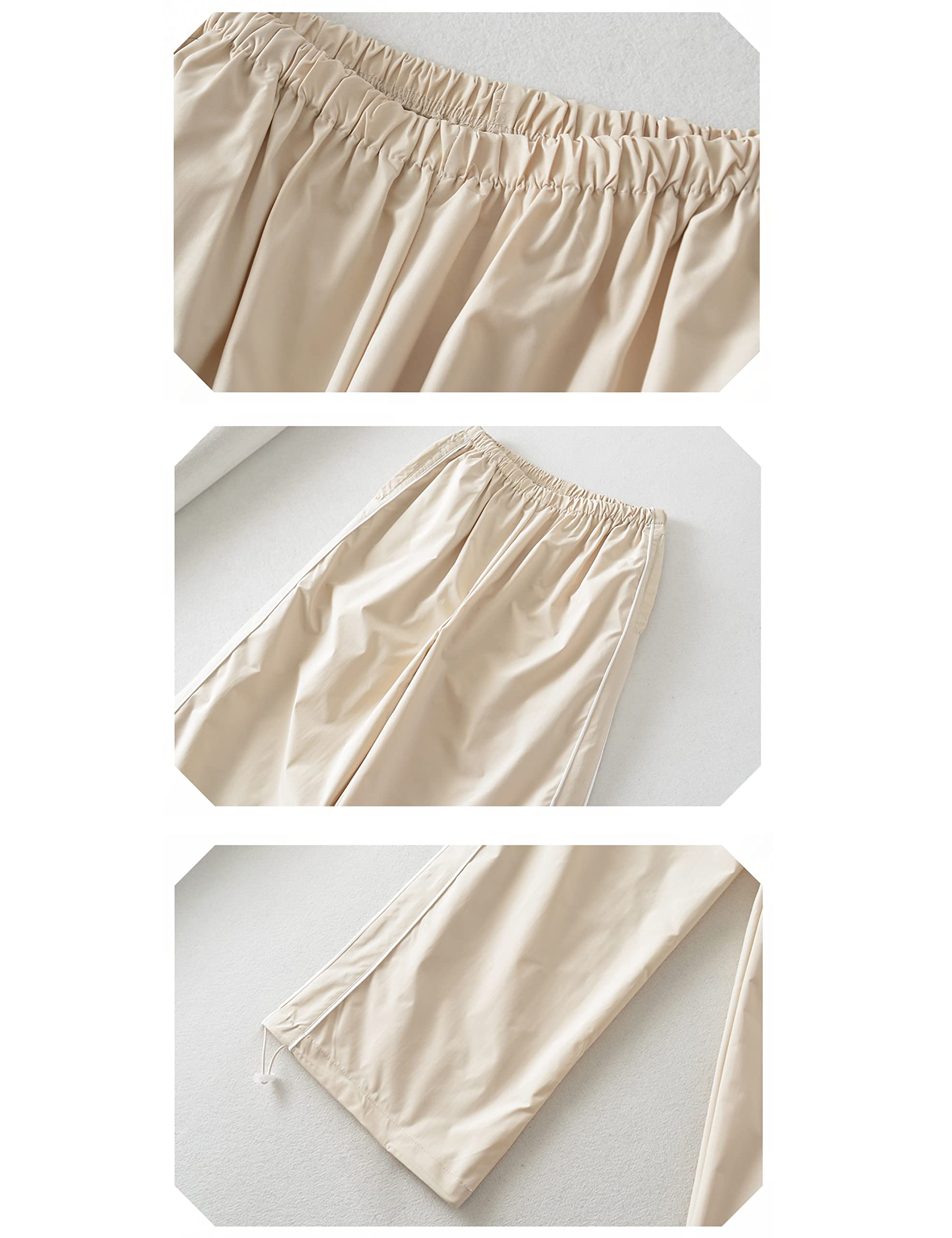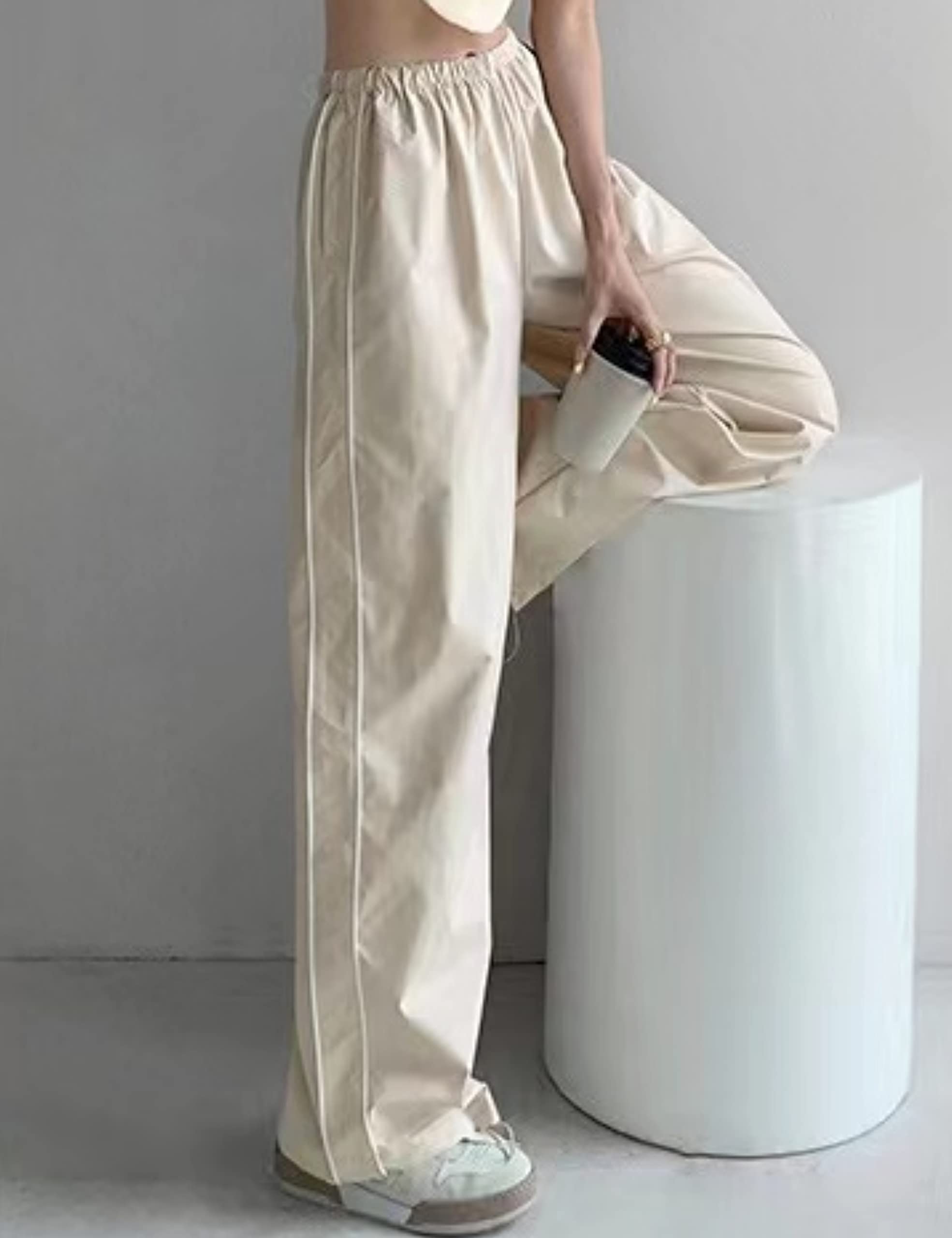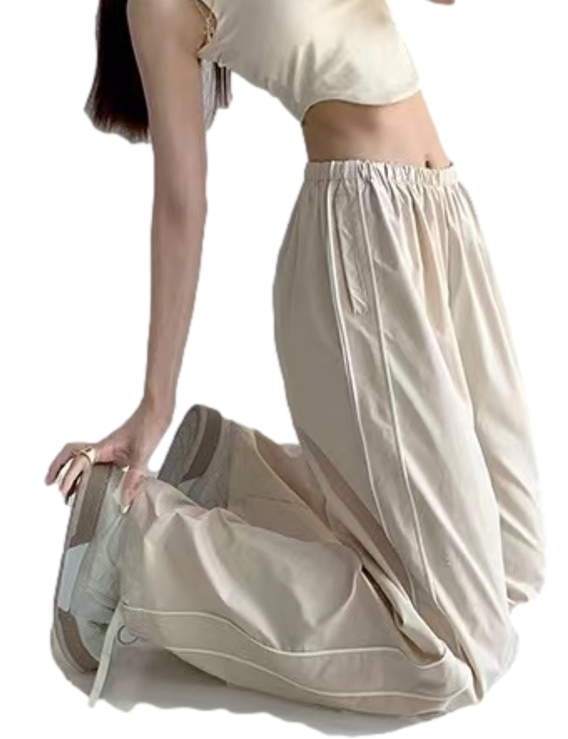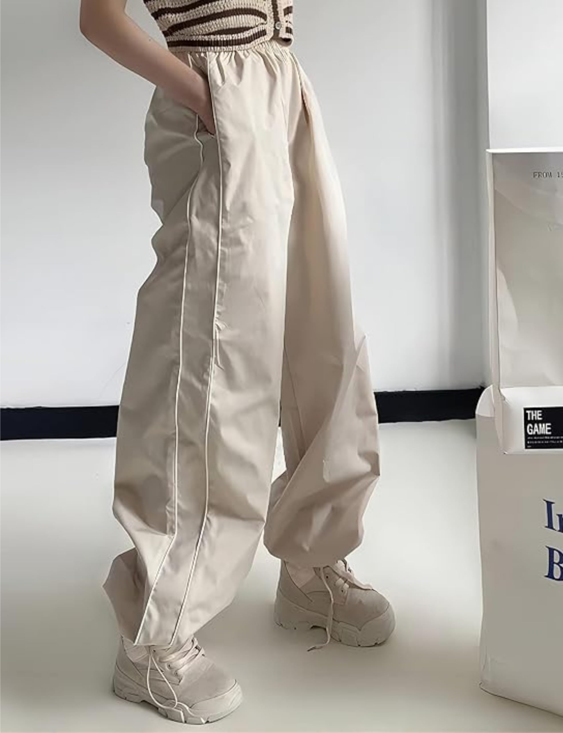 Design: Casual loose parachute pants for women, baggy sweatpants, ankle full length, wide leg trousers, straight leg pants, elasticized stretchy waistband for a flexible fit, simple but versatile, striking side stripes, welt side pockets, adjustable drawstring cuff, adding fashion to your overall dress