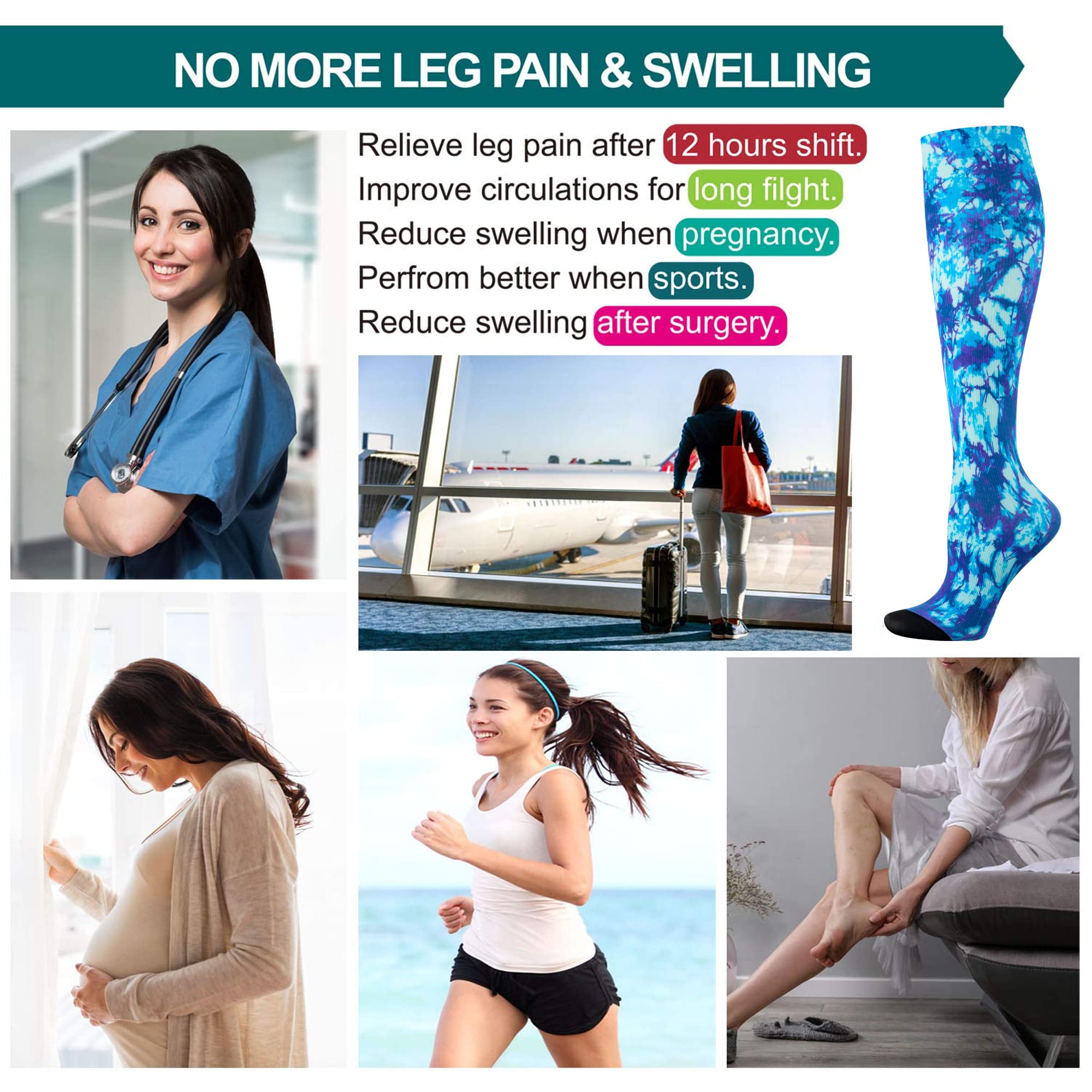 COMPRESSION SOCKS 20-30 mmHg. A Durable Compression Socks have wide variety of fun colors and designs specially for nurses, size rang cover both women and men. Double stitched with functional Fabric and knitted with seamless compression technology. Fits comfortable, easy to get on and delivers 360° support to feet and legs. Knee high long sleeves compression socks make sure the graduated support effect entire calf.