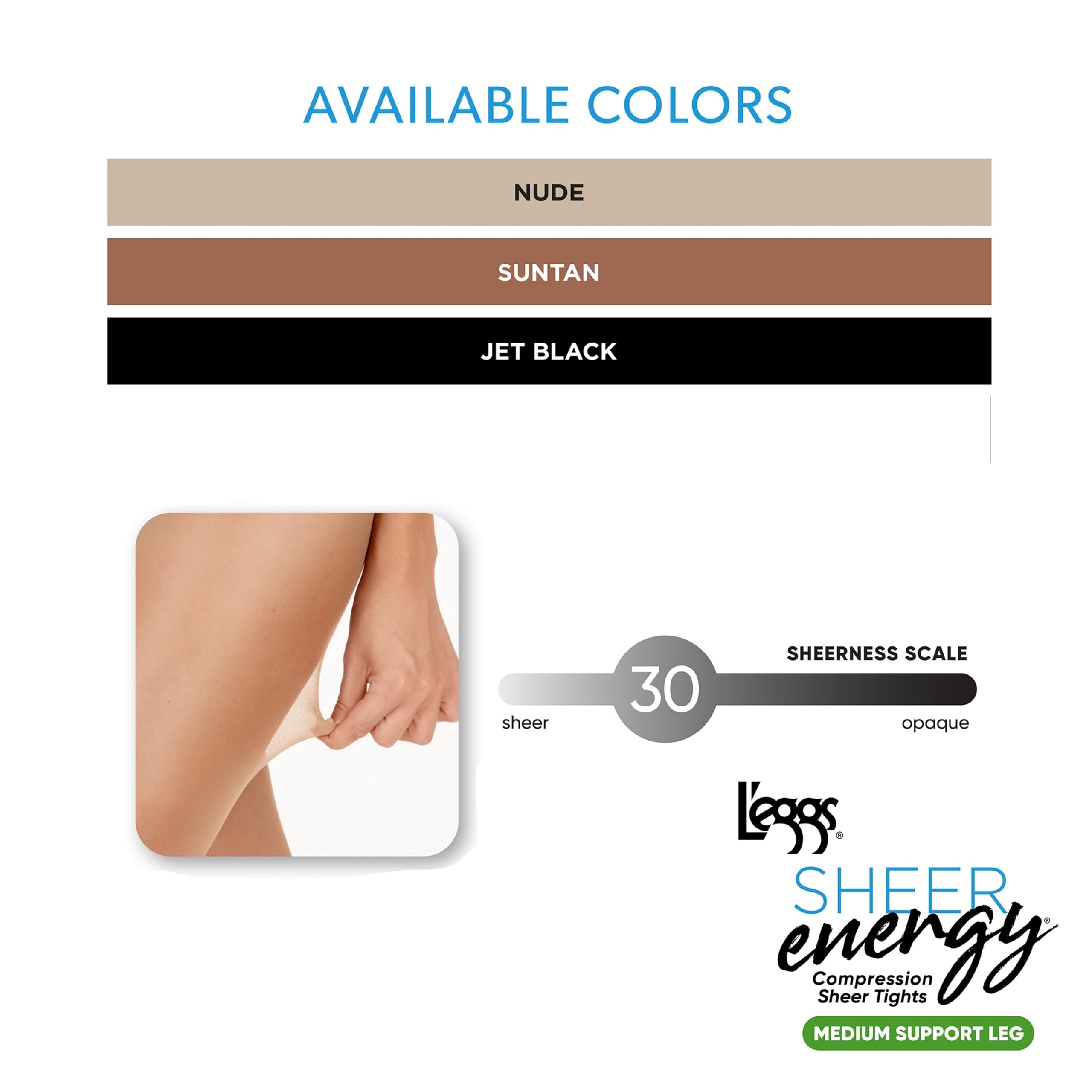 MEDIUM SUPPORT: Enhanced with micro toning technology, L'eggs Sheer Energy Tights enhance your silhouette for a smooth, toned appearance while keeping you feeling comfortable & vibrant; Perfect for when you want style that supports you throughout the day.