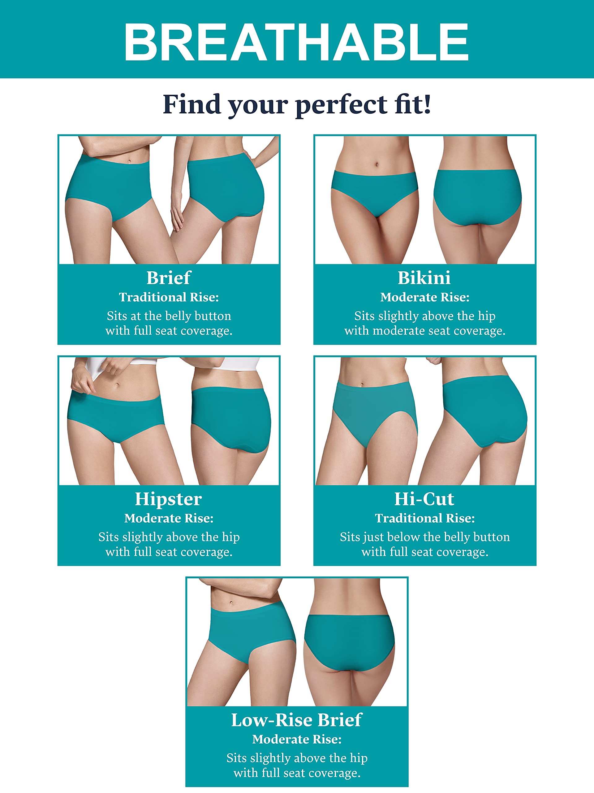Description Fruit of the Loom Breathable Cotton-Mesh hipsters are just what you need to help you stay cool and fresh all day long. These panties are made with breathable, cotton-mesh fabric that not only supports the flow of air but wicks away moisture to keep you dry. Not only will these panties keep you feeling your best all day long, they’re designed with comfort in mind. Soft leg bands and a comfort-covered waistband provide added comfort, and as always, our Fruit of the Loom panties are tag free and made with a 100% cotton liner for extra softness. The contemporary hipster silhouette sits slightly above the hips.