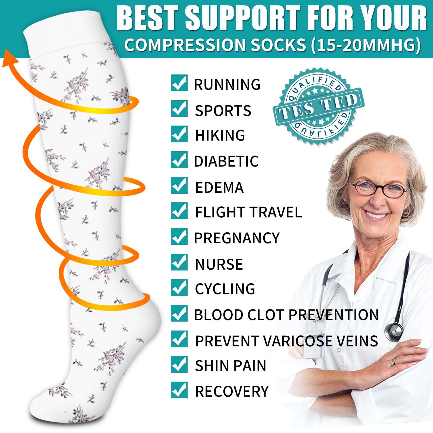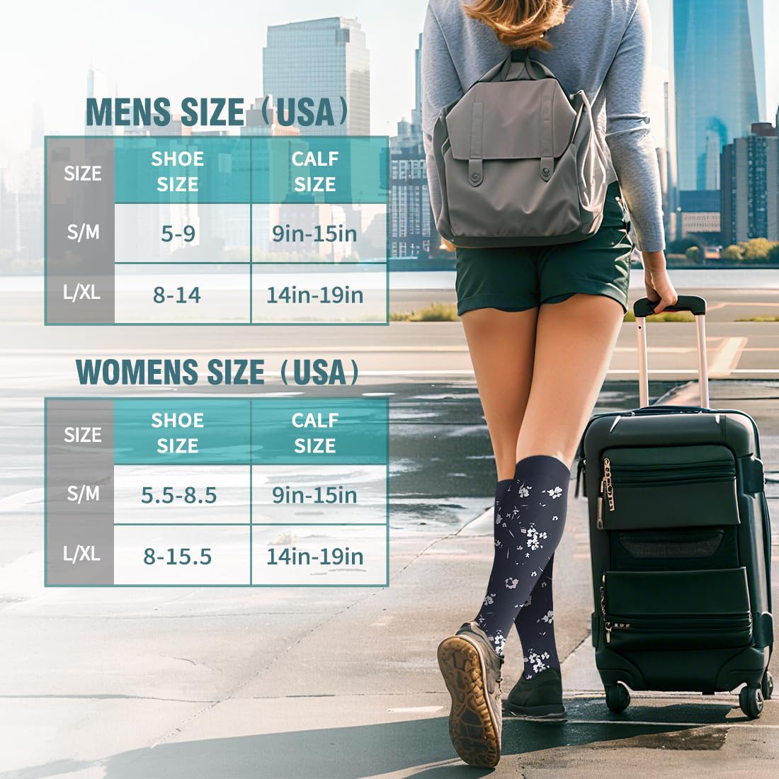 UPGRADE YOUR COMPRESSION SOCKS DRAWER! - With all the tasks of work and family (and of life itself!) we may forget to pay attention to and maintain the health of our legs. Our compression socks are designed to help increase circulation, improve leg and foot comfort, and reduce soreness and swelling, increase energy, All day comfort.Great for long periods of sitting or standing, endurance sports, flying and travel, post-workout recovery, pregnancy, and spider & varicose veins.