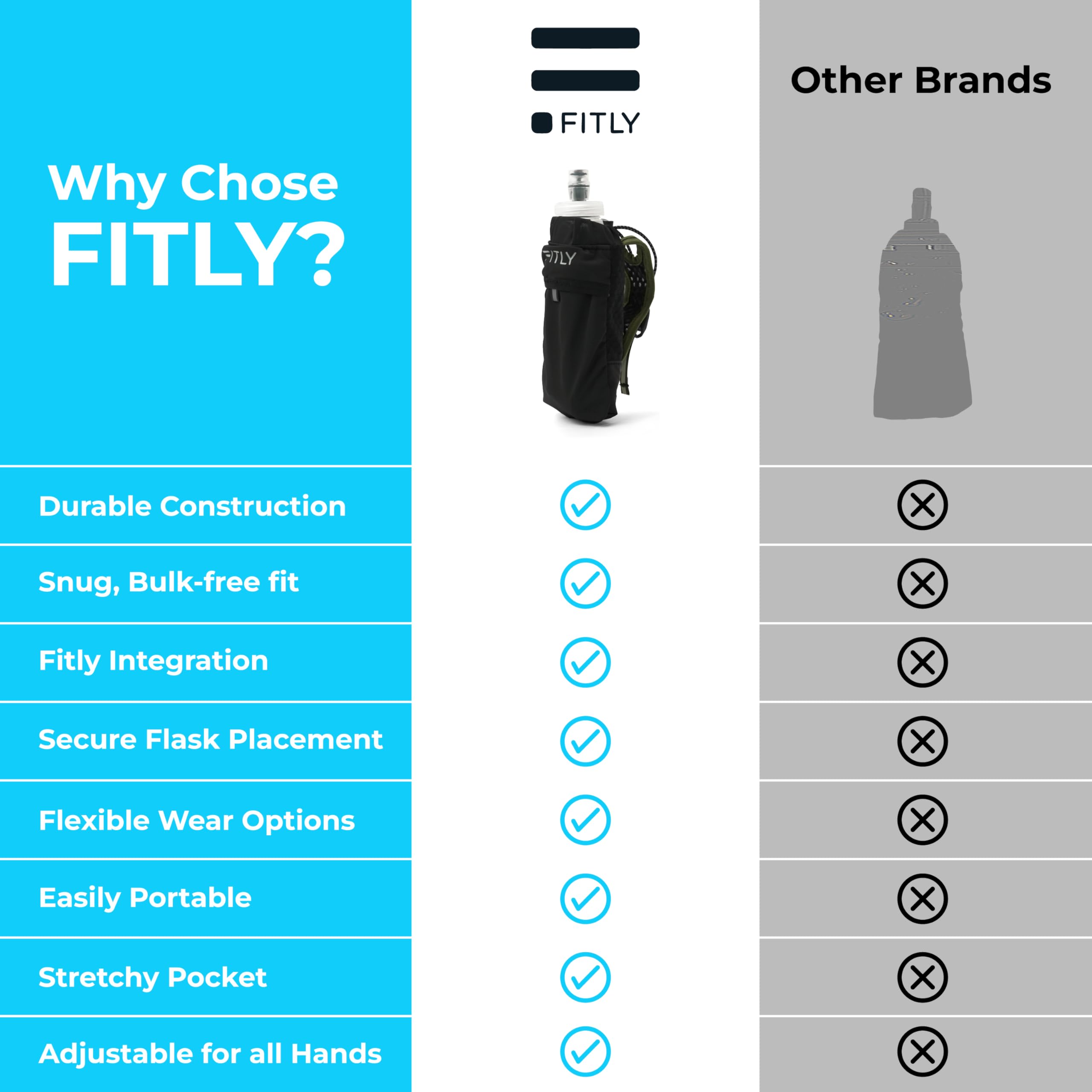 OPTIMIZED FOR ACTIVE LIFESTYLES: Engineered for runners, hikers, and fitness enthusiasts, the FITLY handheld water bottle is built to endure rigorous activities. The holder’s durable construction ensures your soft water flask stays securely in place throughout your journey, no matter the terrain. Run with no limitations with our handheld water bottle.