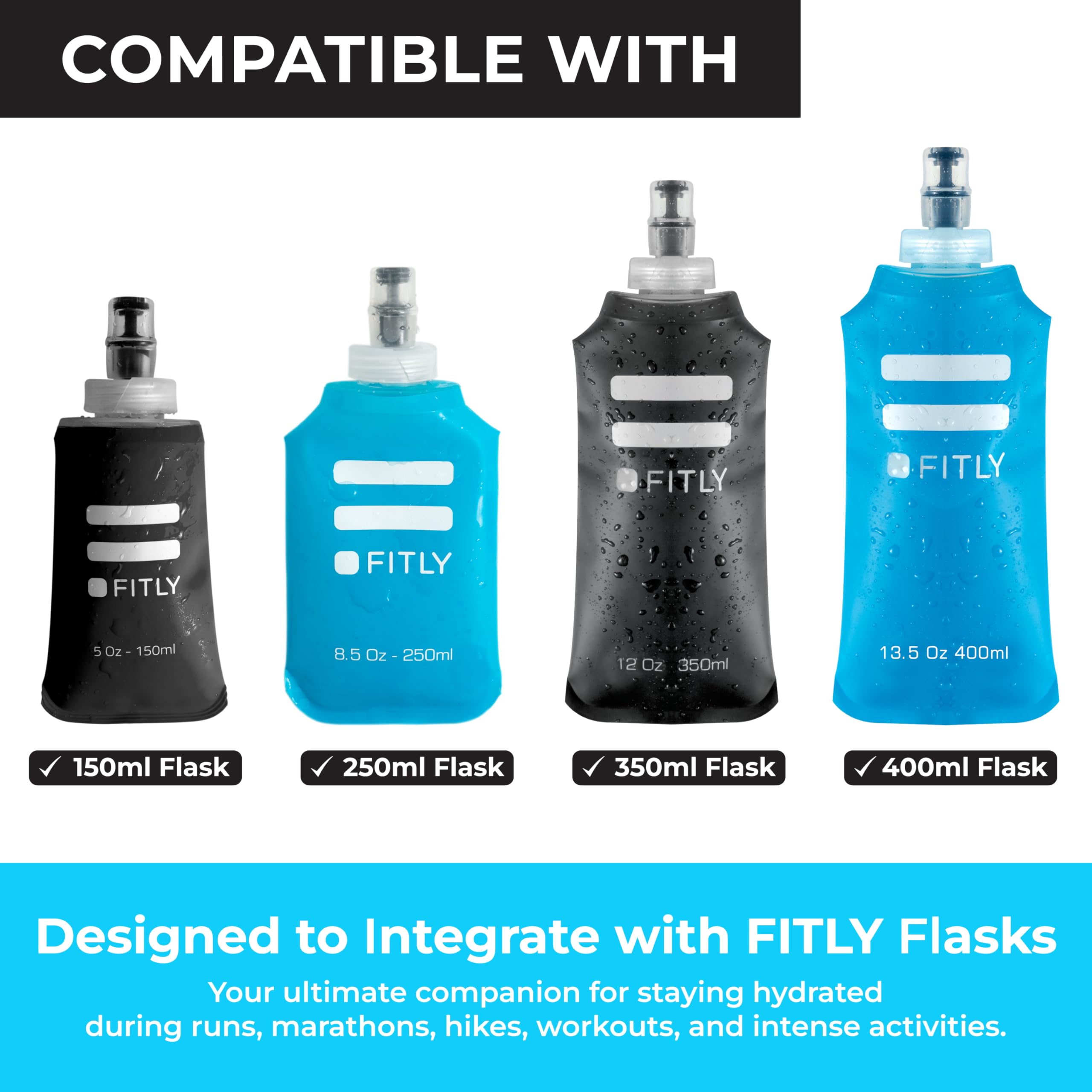 CUSTOMIZED FITLY SOFT FLASK INTEGRATION: Your ultimate companion for staying hydrated during runs, trail running, marathons, hikes, workouts, and intense activities. Our handheld water bottle for running has been tailored exclusively for Fitly Flasks (F1, F2, F3, F4, F3LFG), ensuring a snug fit and eliminating unnecessary bulkiness. With the included F3LFG 300ml (10 oz) flask and the option to swap with other FITLY flasks, you have versatile hydration solutions at your fingertips.