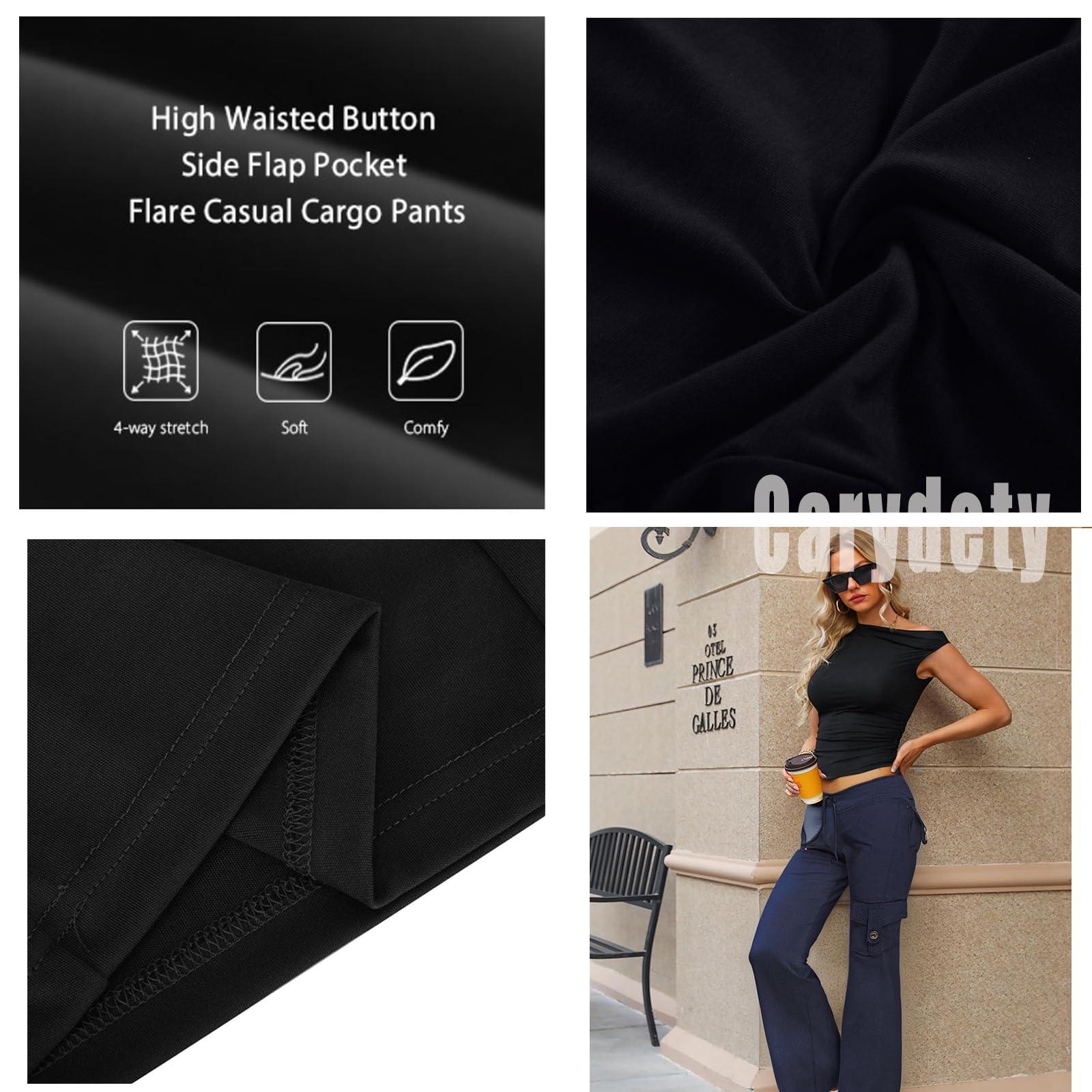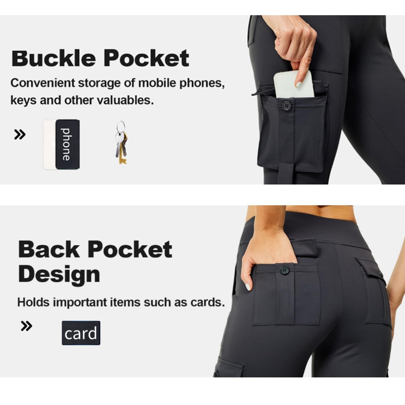 VERSATILE DESIGN: Womens cargo pants, High-waisted style with adjustable drawstring waistband ensures a secure. Wide-leg yoga cargo pants featuring convenient side pockets and decorative button details for both athletic and casual wear. Flattering bootcut silhouette with contrast stitching and functional button accents on cargo pockets
