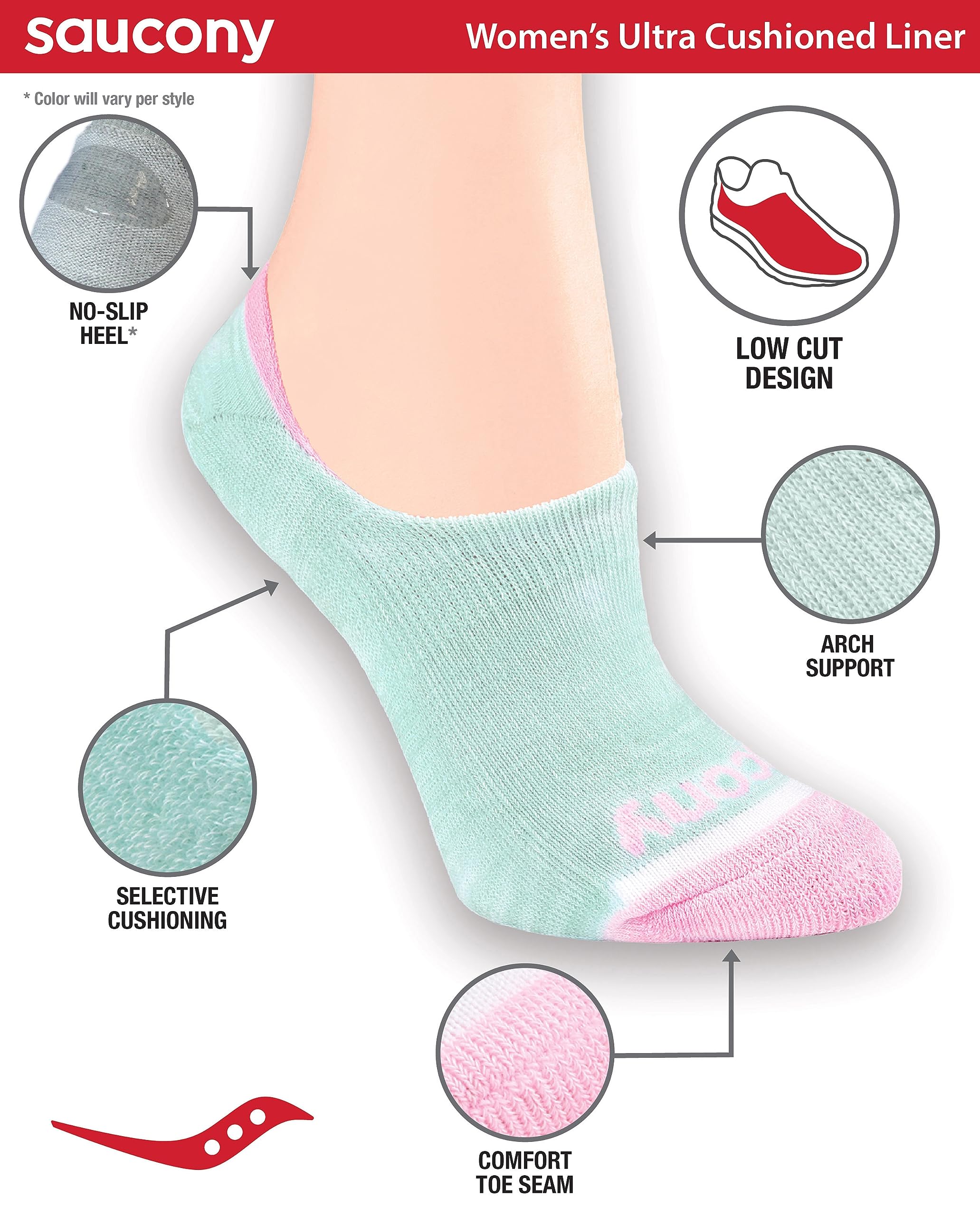 Description Saucony women's performance liner socks is a perfect combination of comfort, stay-put fit. Great for the toughest training session or when you just want comfortable Feet all day. Features include silicone heel grip for stay-put socks, arch support and select cushioning for lasting comfort, Comfort toe seam, and air mesh ventilation.