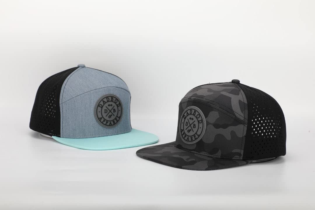 Premium materials and craftsmanship. 95% Polyester, 5% Spandex. Snap Closure. Perforated back for breathability and comfort. Dadbod Circle Logo printed on underbill.