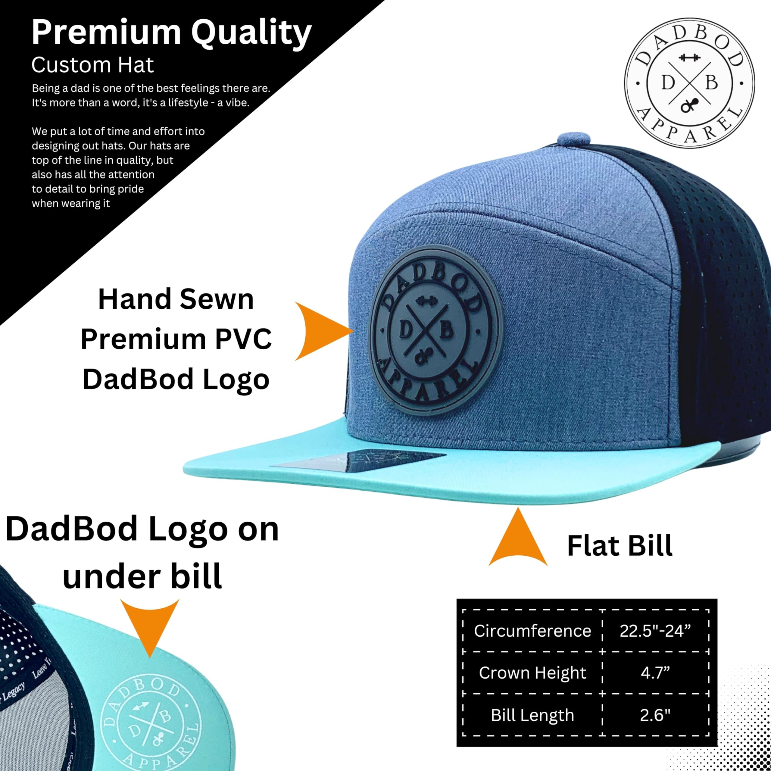 Fully custom 6 panel hat with attention to detail all around. Moisture wicking material - made to last. Awesome Dad Birthday Gift for Birthday, Fathers Day or Christmas.