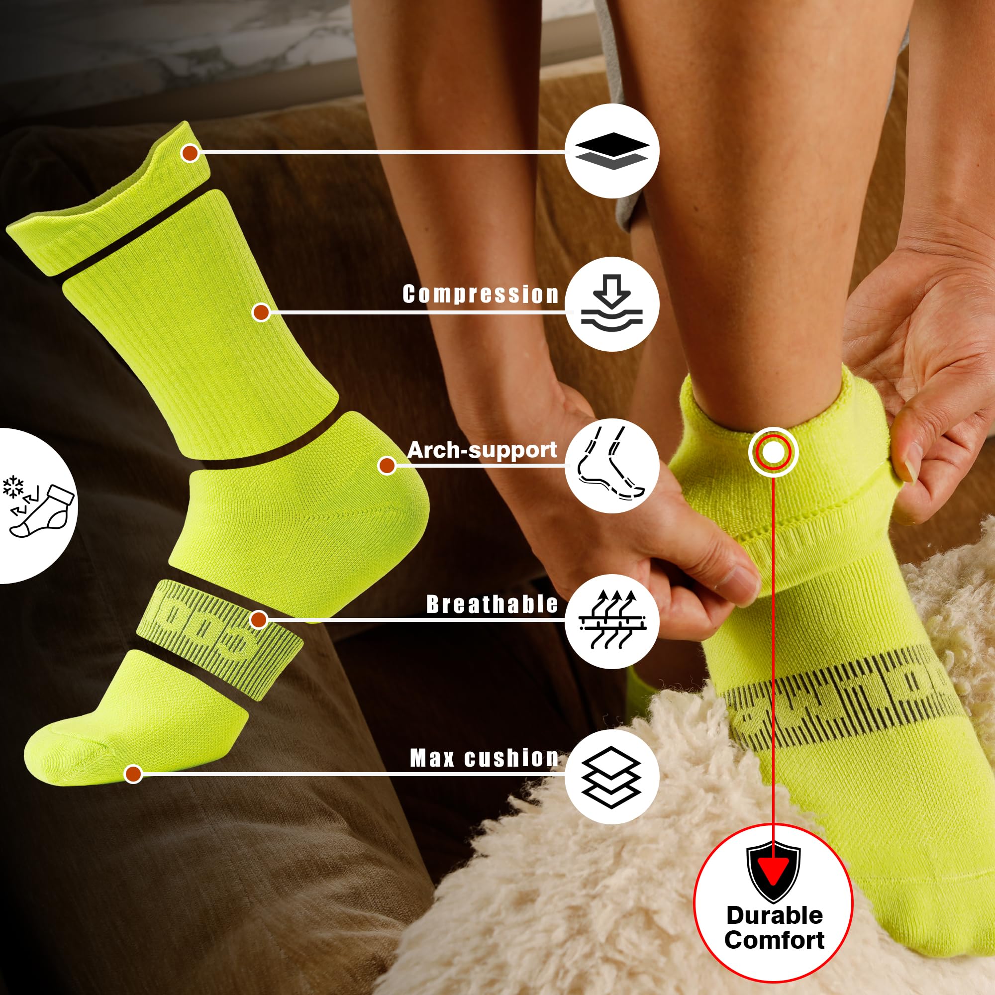 [Compression Design & Arch Support System] These athletic performance socks are designed with compression, providing just the right amount of compression and an arch support system that ensures supportive stability for the arches during intense exercise while maintaining ankle flexibility. The proper compression band designed in the arch fits the individual shape of your foot, hugging your foot evenly to keep the sock in position in your shoe.