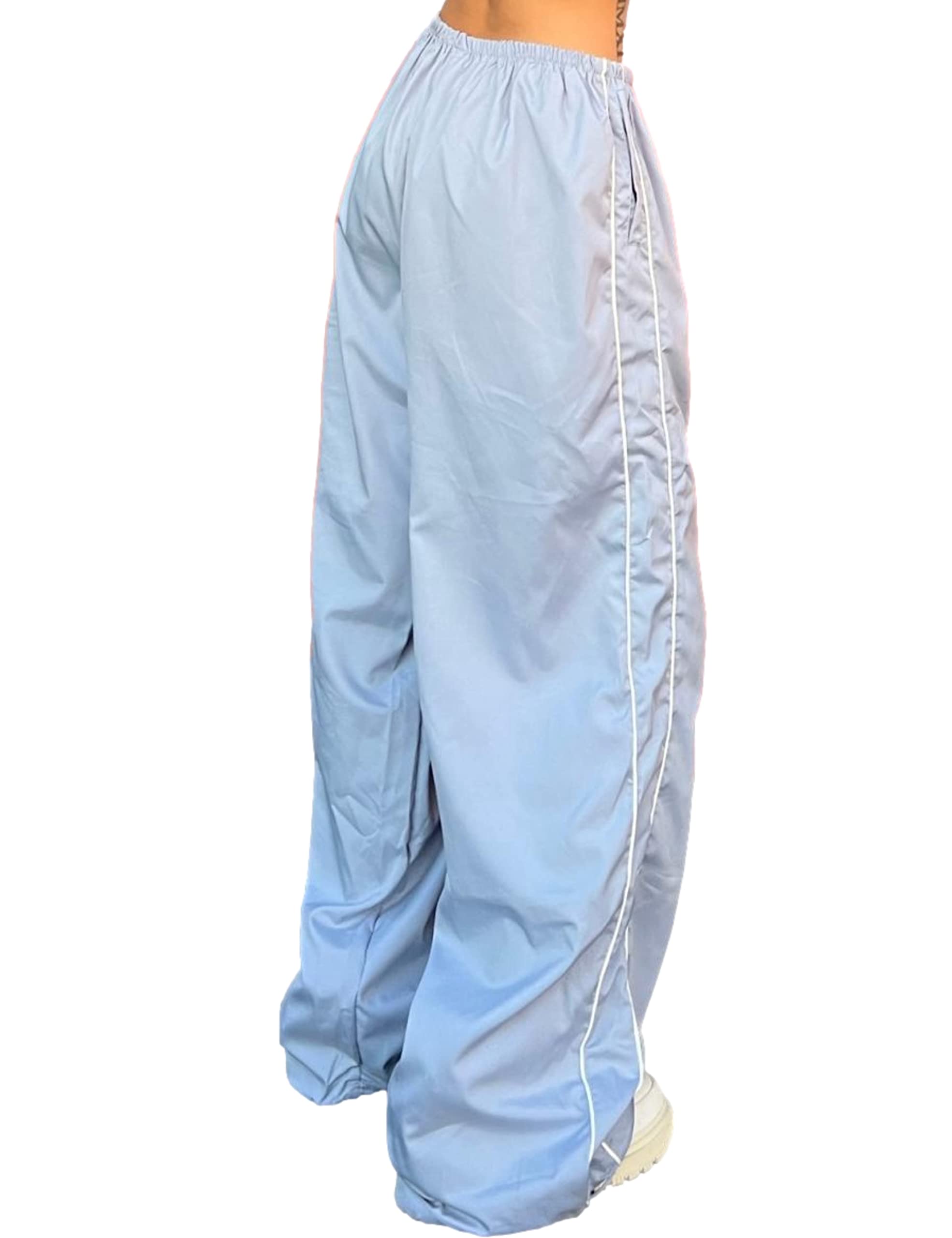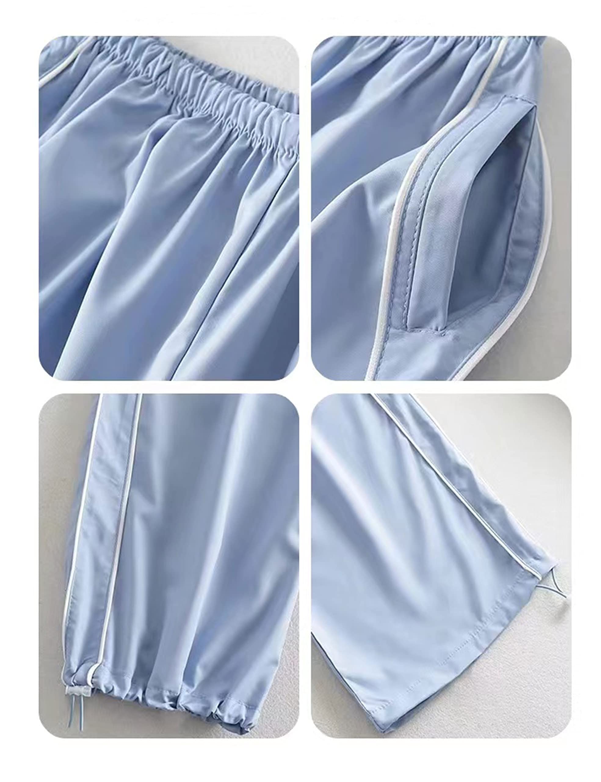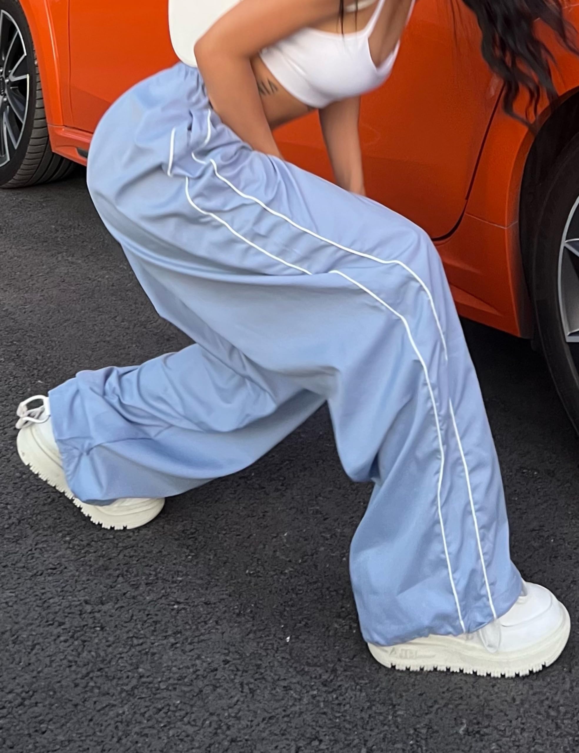 Design: Casual loose parachute pants for women, baggy sweatpants, ankle full length, wide leg trousers, straight leg pants, elasticized stretchy waistband for a flexible fit, simple but versatile, striking side stripes, welt side pockets, adjustable drawstring cuff, adding fashion to your overall dress
