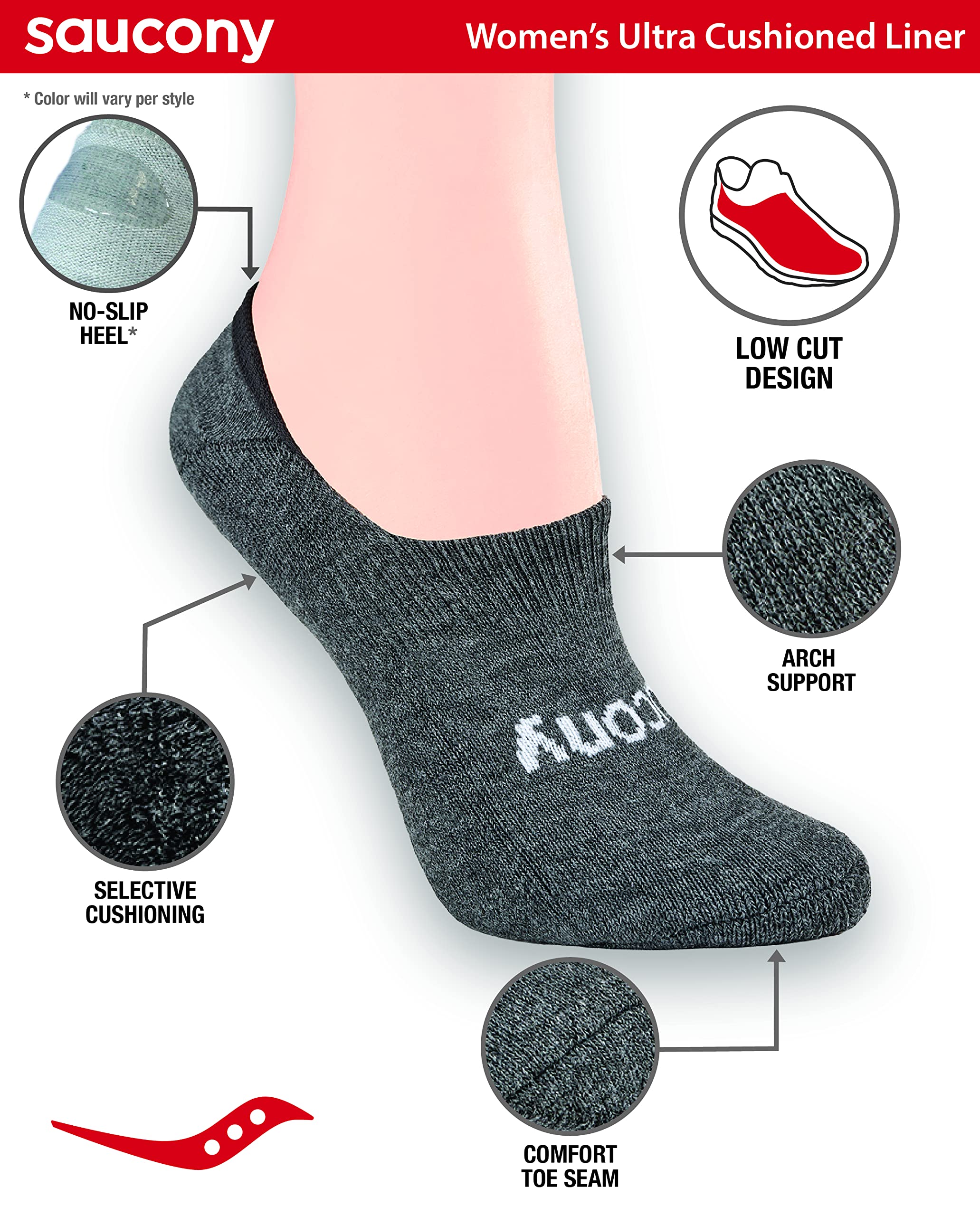 Description Saucony women's performance liner socks is a perfect combination of comfort, stay-put fit. Great for the toughest training session or when you just want comfortable Feet all day. Features include silicone heel grip for stay-put socks, arch support and select cushioning for lasting comfort, Comfort toe seam, and air mesh ventilation.