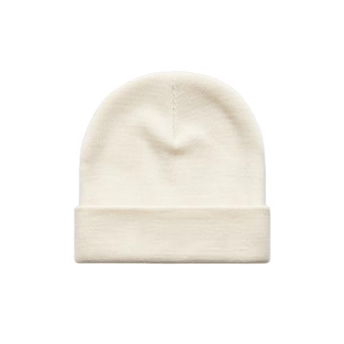 Front - Cream beanie decorated with MC initials logo in gold thread embroidery on cuff