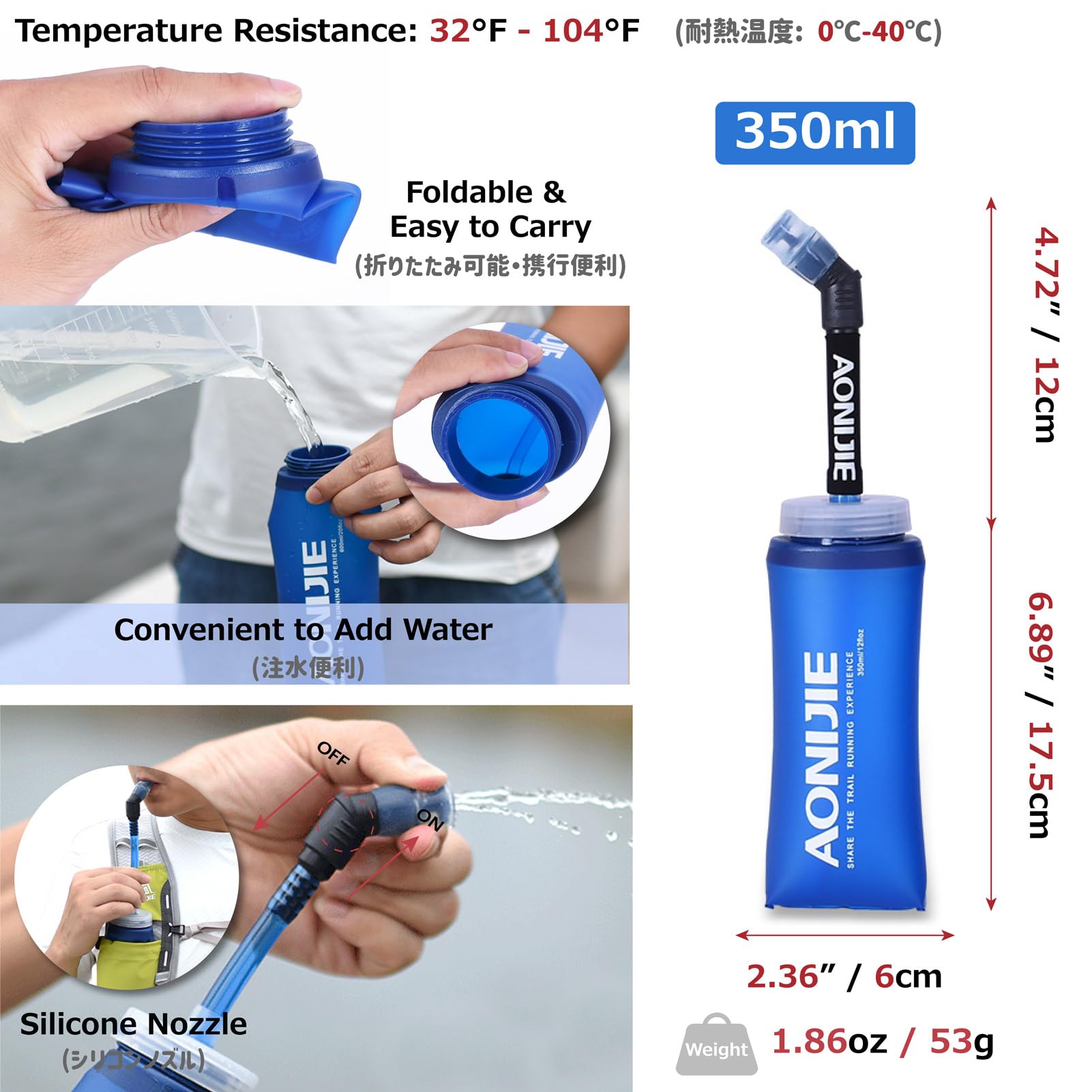 350ml TPU soft bottle: 100% BPA and PVC-free. Simply bite the nozzle to drink without affecting your stride. The push-pull lock, combined with a unique design that contracts while drinking and the drawstring tightening, prevents wobbling or bouncing