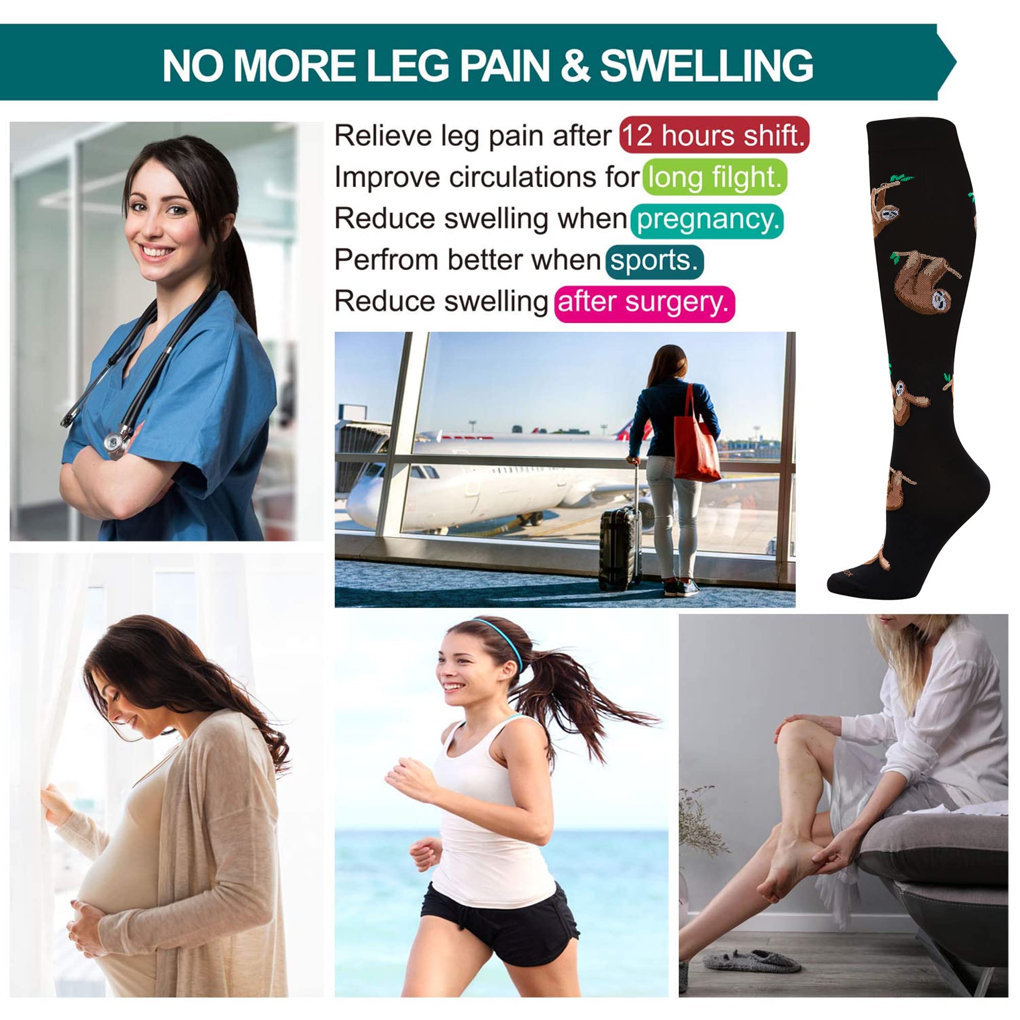 COMPRESSION SOCKS 20-30 mmHg. A Durable Compression Socks have wide variety of fun colors and designs specially for nurses, size rang cover both women and men. Double stitched with functional Fabric and knitted with seamless compression technology. Fits comfortable, easy to get on and delivers 360° support to feet and legs. Knee high long sleeves compression socks make sure the graduated support effect entire calf.