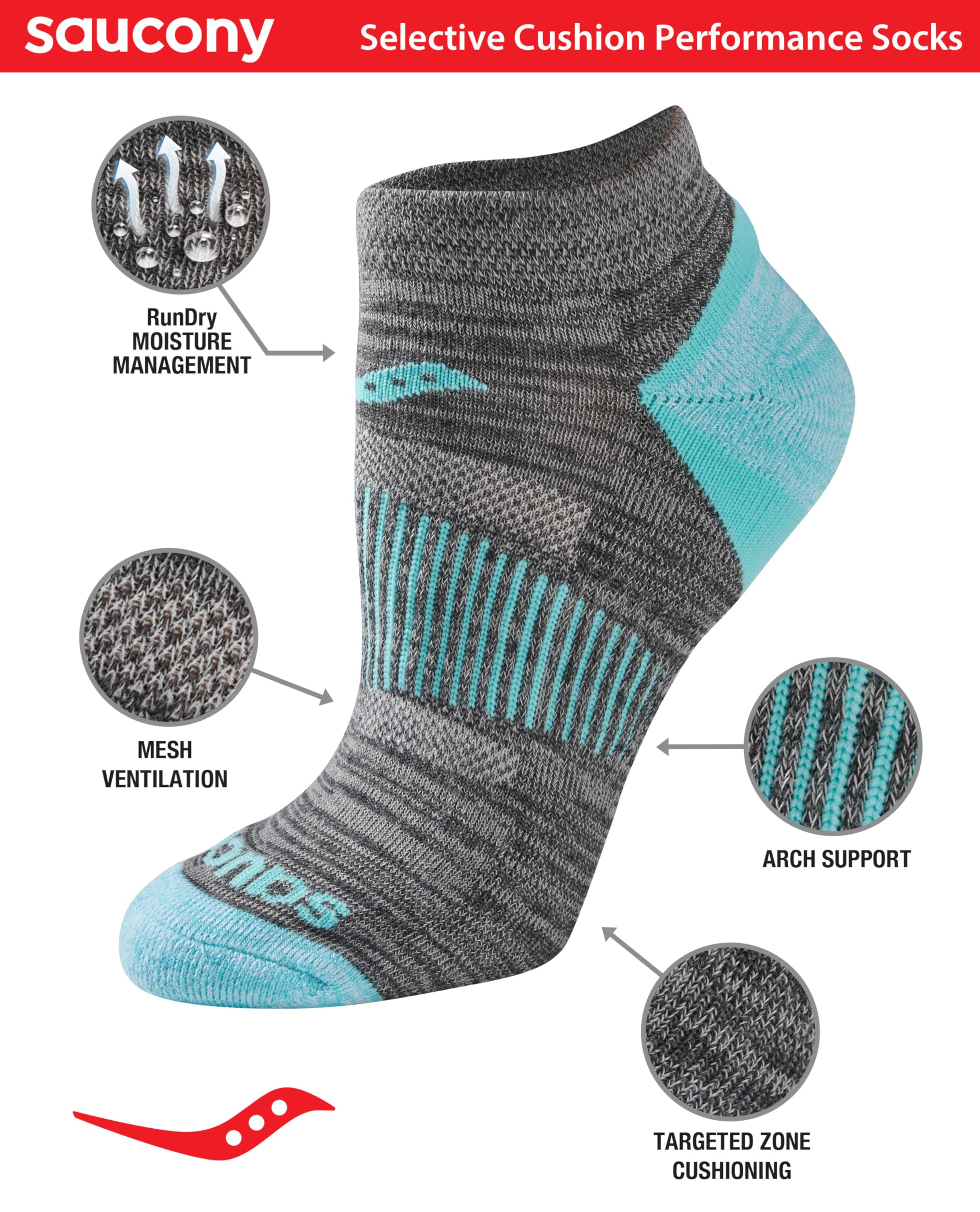 Description Saucony women's performance no show sock is a perfect combination of comfort and support. Great for the toughest training sessions. Features arch support, air mesh venting, and cushioned sole for lasting comfort. Run for Good - Saucony was founded way back in 1898. Ever since, we have been loyal to the sport, building goodness into every product and inviting millions around the world to run with us. At Saucony, we exist for runners, Runners inspire us, bringing us new idea, force us to be better, they drive our design and engineering. They keep us competitive. They keep us hungry. They keep us honest. This focus and passion fuels us as we strive to create the best running shoes and apparel on the planet. We leave work each day knowing we’ve done everything to make runners live just a little better.