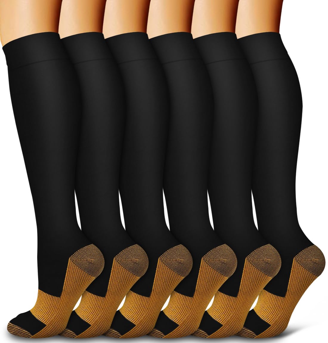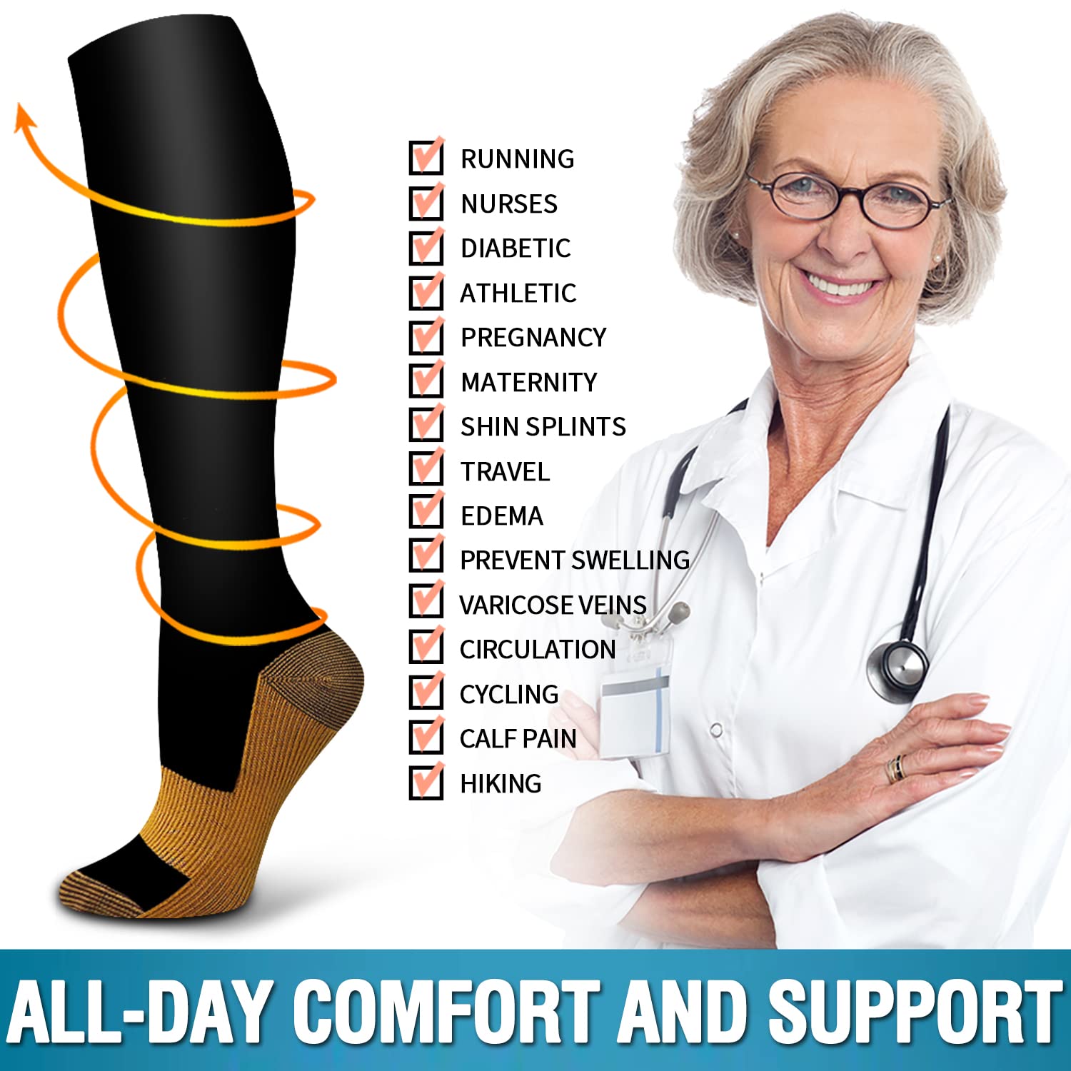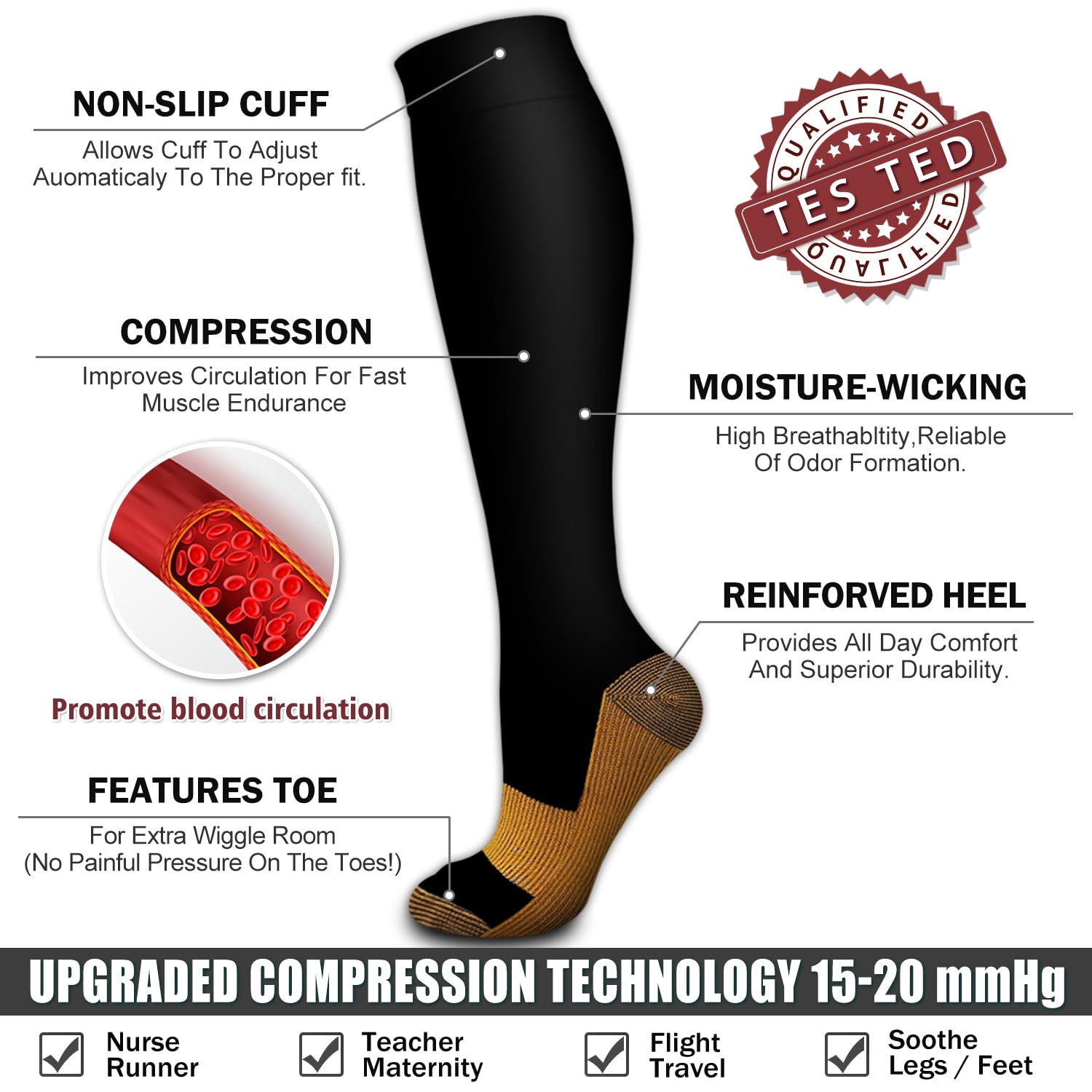 GIVE LIFE TO YOUR LEGS! - More improve circulation means more Healthier legs and less pain+swelling.Our Graduated Compression Socks put pressure in just the right spots.Provides true graduated compression to support your legs,reduce fatigue,soreness,and prevent injuries at the same time.Progressive compression technology has been recognized by many users Our copper compression socks is self-care staples.Make you feel great-no matter where,no matter when,and no matter what you're up to!