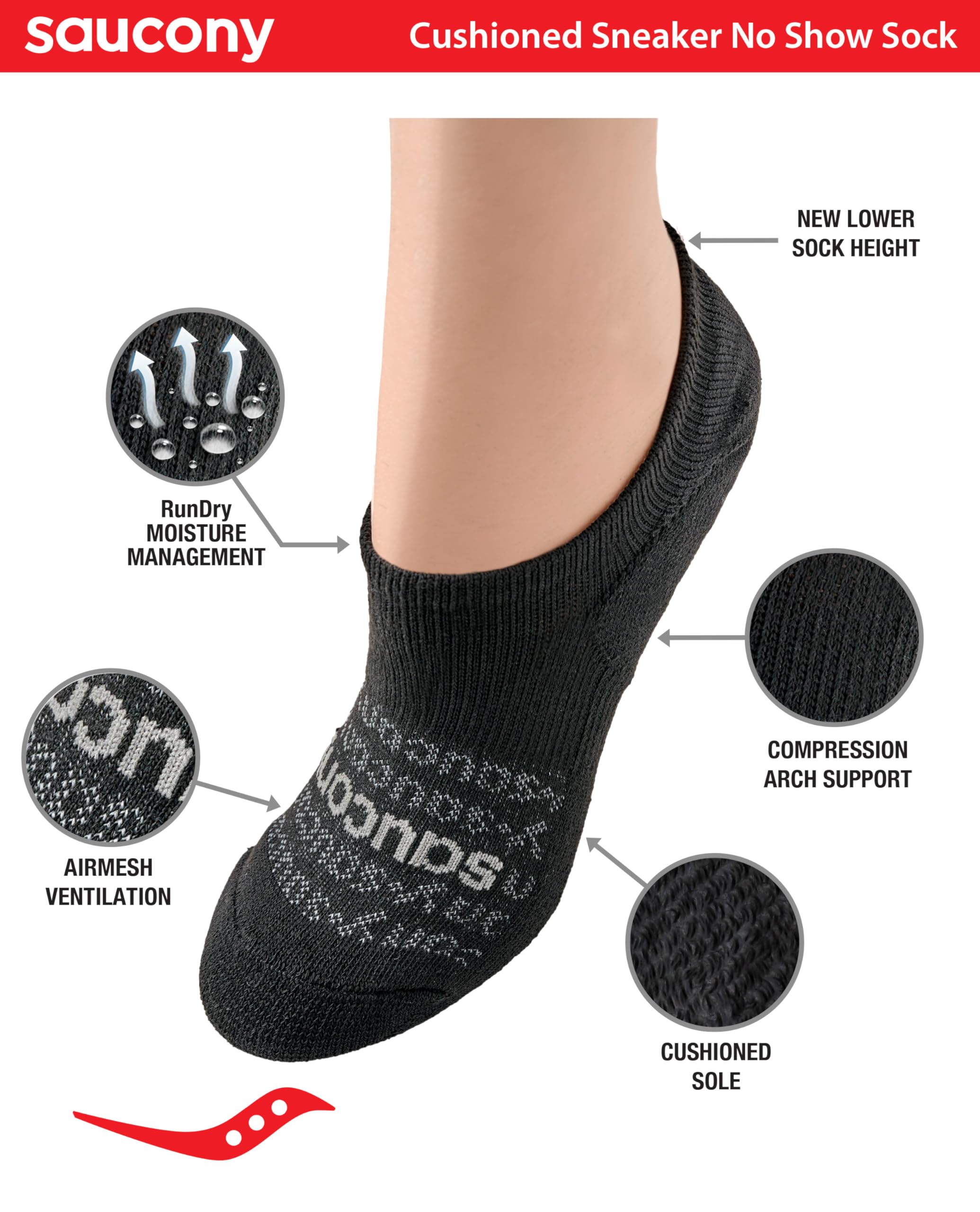 Description Saucony women's performance no show sock is a perfect combination of comfort and support. Great for the toughest training sessions. Features arch support, air mesh venting, and cushioned sole for lasting comfort. Run for Good - Saucony was founded way back in 1898. Ever since, we have been loyal to the sport, building goodness into every product and inviting millions around the world to run with us. At Saucony, we exist for runners, Runners inspire us, bringing us new idea, force us to be better, they drive our design and engineering. They keep us competitive. They keep us hungry. They keep us honest. This focus and passion fuels us as we strive to create the best running shoes and apparel on the planet. We leave work each day knowing we’ve done everything to make runners live just a little better.
