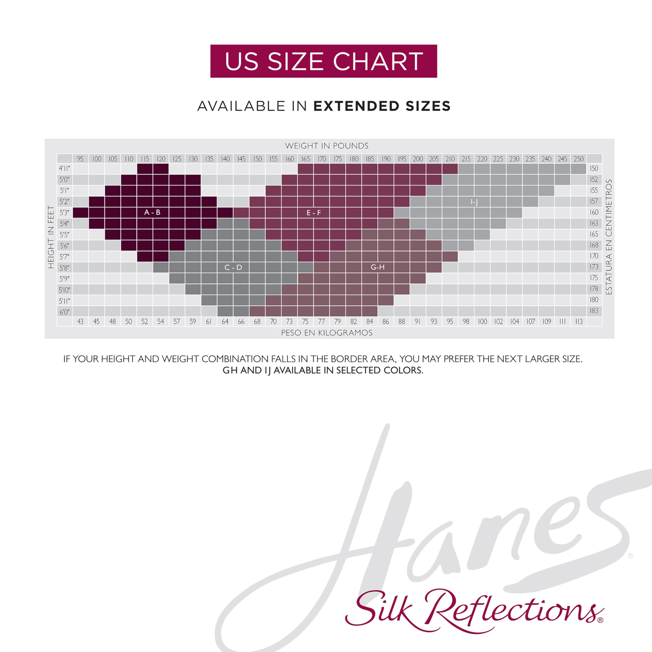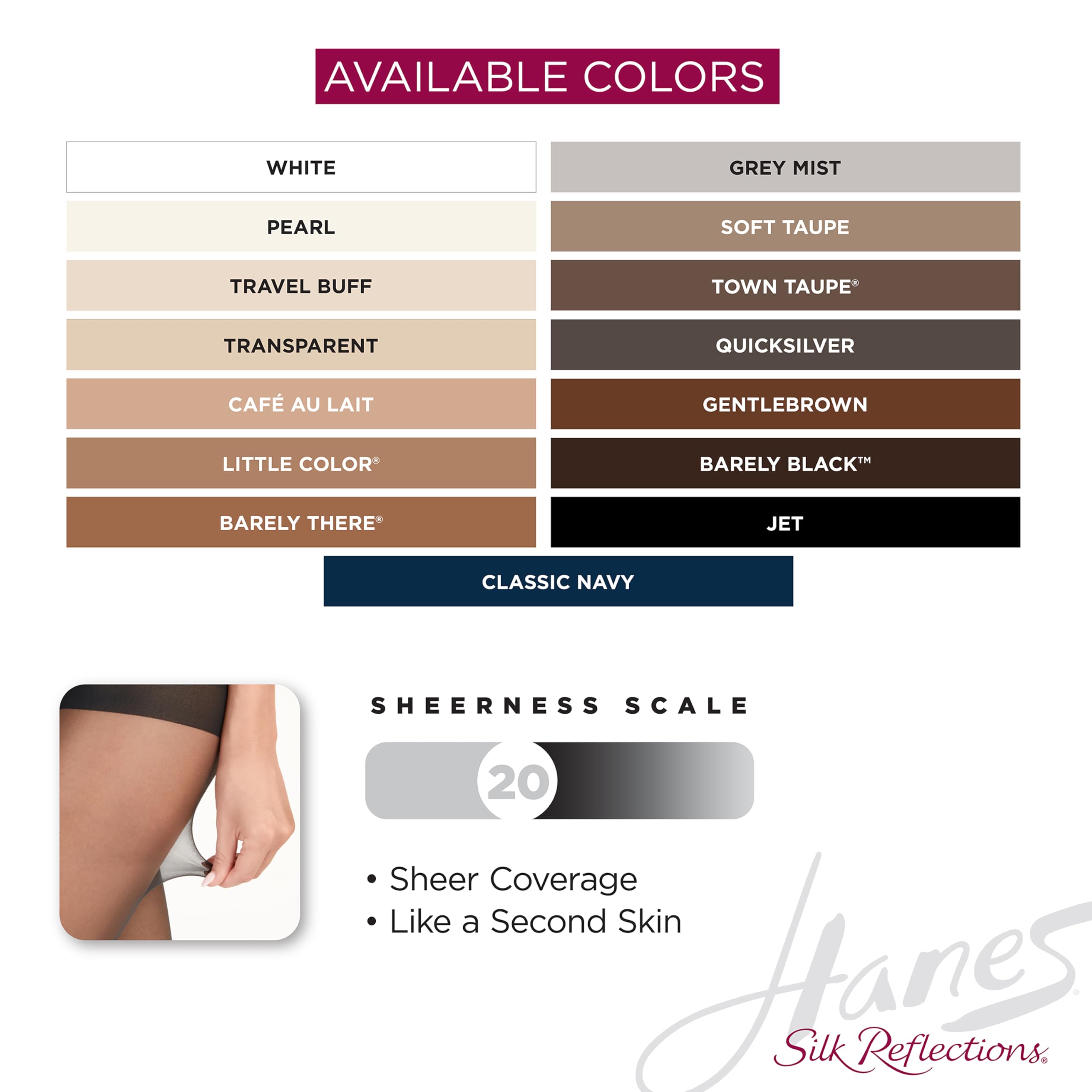 Description Product Description Step into sheer elegance with Hanes Silk Reflections Pantyhose, the epitome of comfort and sophistication. These sheer tights are meticulously crafted with the finest materials, ensuring a luxurious feel and exceptional quality. The attention to detail in design is evident in every aspect, from the smooth even weave to the flawless finish. Designed with a flattering control top, Hanes Silk Reflections hosiery offer gentle shaping and support, ensuring a sleek silhouette beneath any ensemble. Forget about constant adjustments, this control top ensures a secure fit that stays in place all day, eliminating worries about bunching or slipping thoughout the day so you can focus without distractions. Hanes Silk Reflections Pantyhose are designed with your lifestyle in mind. The sheer toe feature allows you to seamlessly pair them with open-toe shoes or sandals, ensuring you never have to compromise on style. Whether you're dressing up for a formal event or adding a touch of elegance to your everyday look, these pantyhose are your go-to for versatile fashion. Hanes Silk Reflections Pantyhose elevate your style with timeless elegance and unmatched comfort. The sheer fabric is lightweight yet durable, providing just the right amount of coverage while allowing your skin to breathe. The meticulous craftsmanship ensures that these tights maintain their shape and sheen, even after multiple wears. Don’t settle for ordinary when you can indulge in the sheer elegance of Hanes Silk Reflections Pantyhose. Elevate your style and experience the ultimate in comfort and sophistication with every step you take. From the Manufacturer Silk Reflections Silky Sheer Control Top Sandlfoot