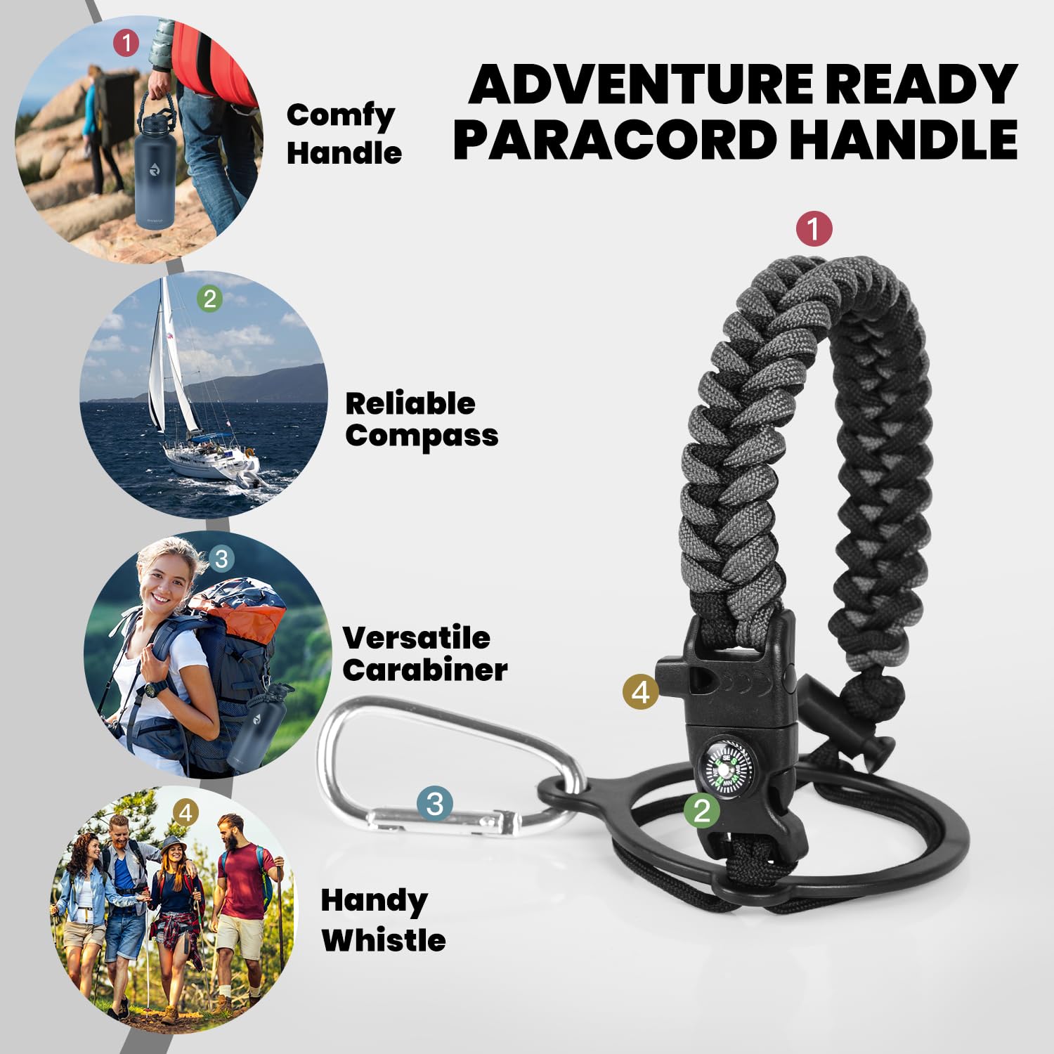 Iconic Paracord Handle: This insulated water bottle comes with a beautiful hand knit nylon paracord in coordinated color with the water bottle. Configured with a compass and carabiner, this paracord handle is a must-have as a full functional camping / hiking flask