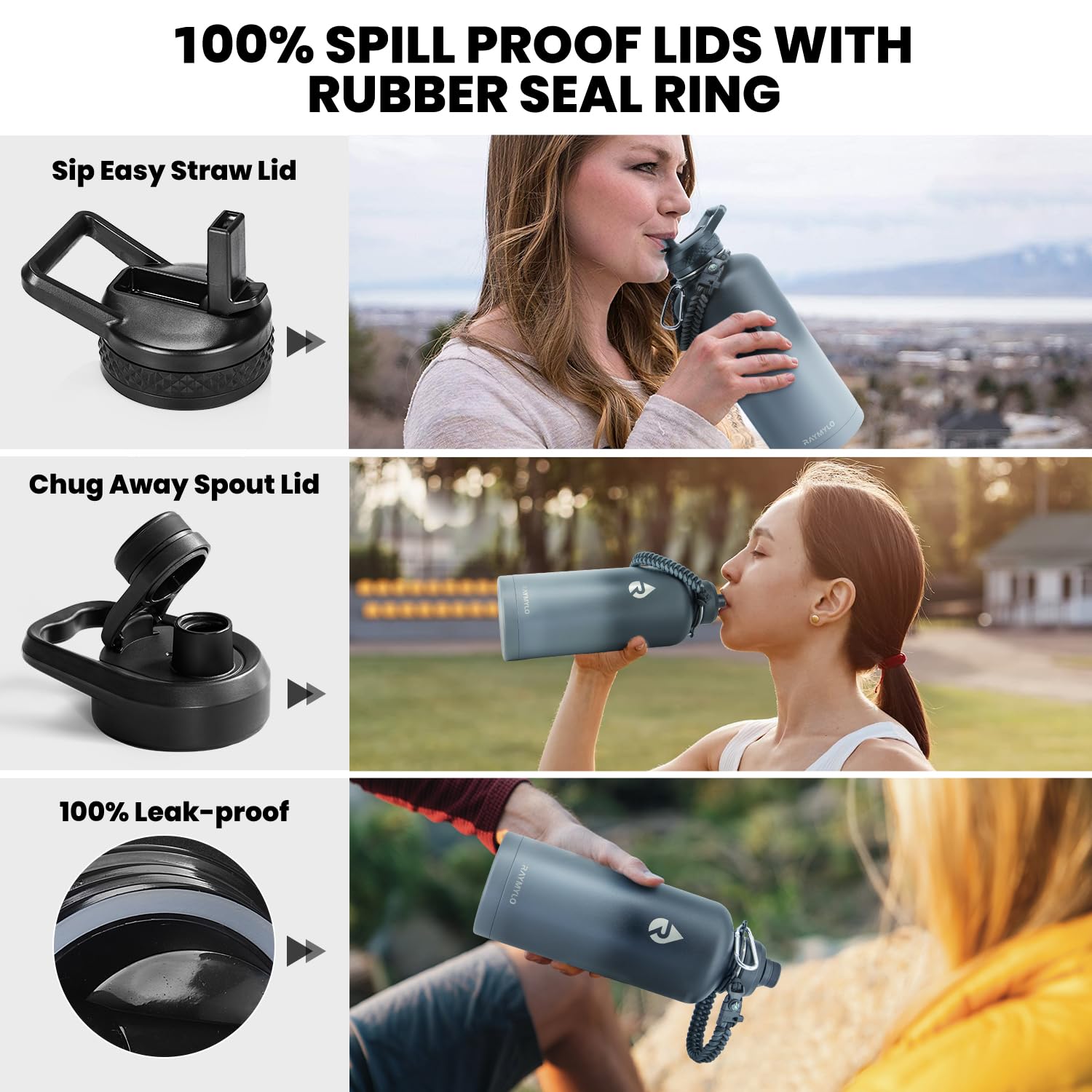 What You'll Get: We offer Continuous After-sales Service and 100% customer satisfaction against any leakage or insulation failure. You purchase contains: RAYMYLO 87oz Water Bottle, Carrying Pouch, Straw Lid with 2 Straws & Straw Brush, Spout Lid, Paracord Handle, Bottle Brush