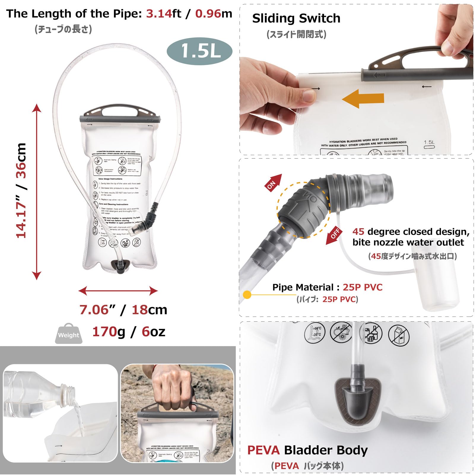 Hydration Bladder: Includes a 1.5L BPA-free PEVA bladder weighing only 6 oz (170 g). Designed with pressure resistance and leak-proof performance to keep you hydrated on hikes, cycling, running, and other outdoor adventures