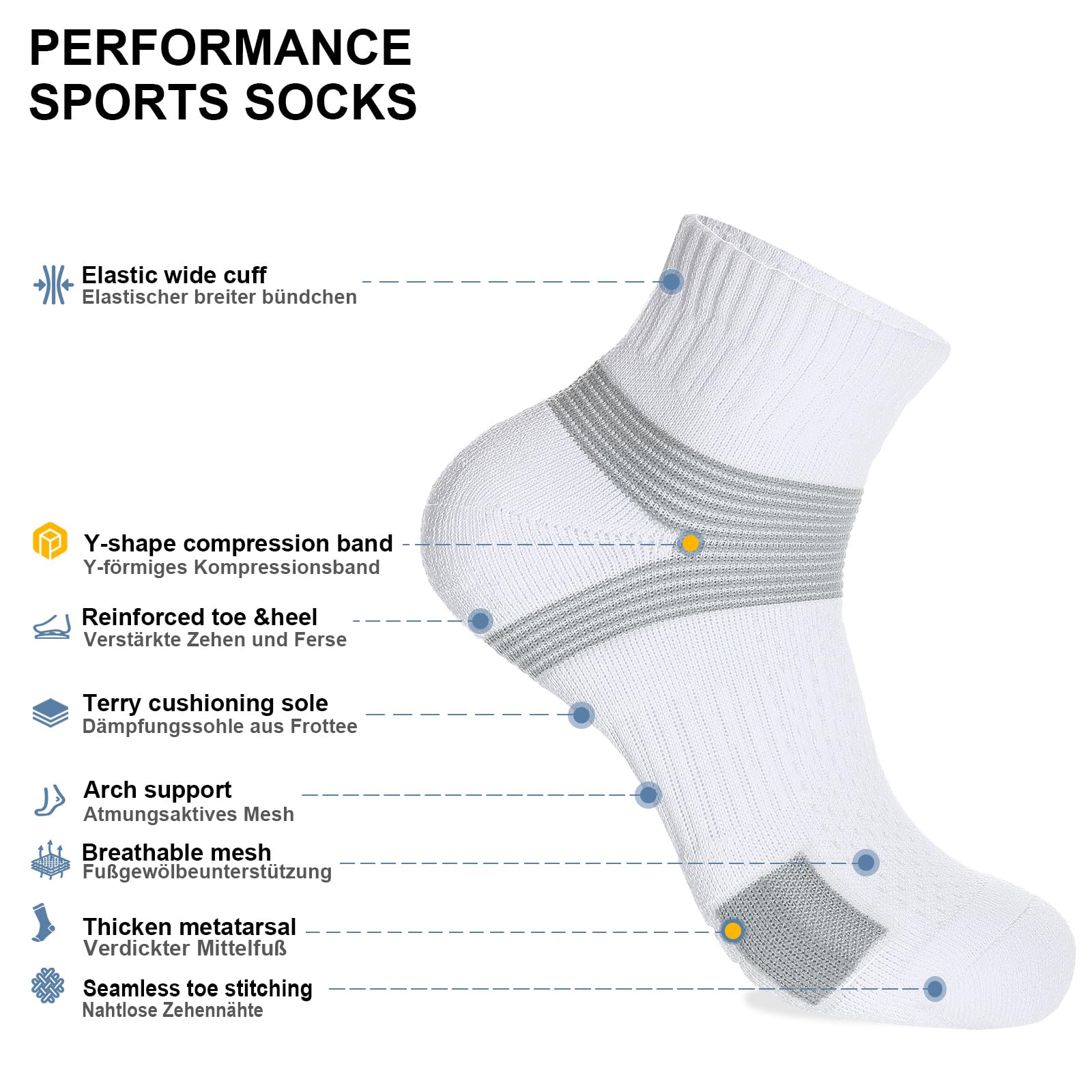 Ankle-compression Sports Socks: The ankle Y-shaped elastic compression band and arch support make the socks fit the foot naturally, which can fix the muscles, prevent shaking, and relieve fatigue; even if you sprint to save the ball, change direction, or stop suddenly, the socks will not shift or fall off.